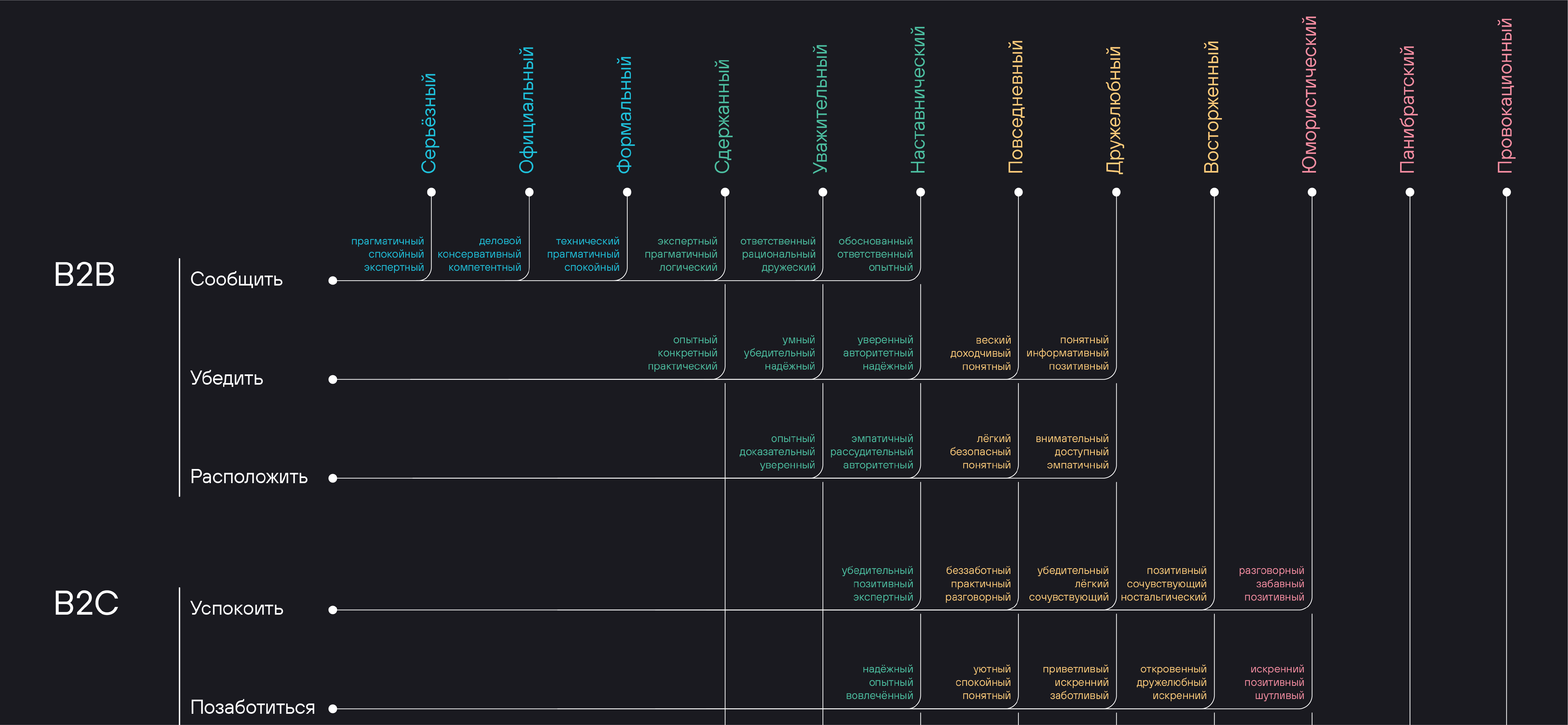 Эта шпаргалка — не универсальное решение. Она поможет найти нужное направление, в котором стоить развивать тональность голоса бренда. Так, чтобы голос цеплял аудиторию, был консистентным и отвечал целям бизнеса.