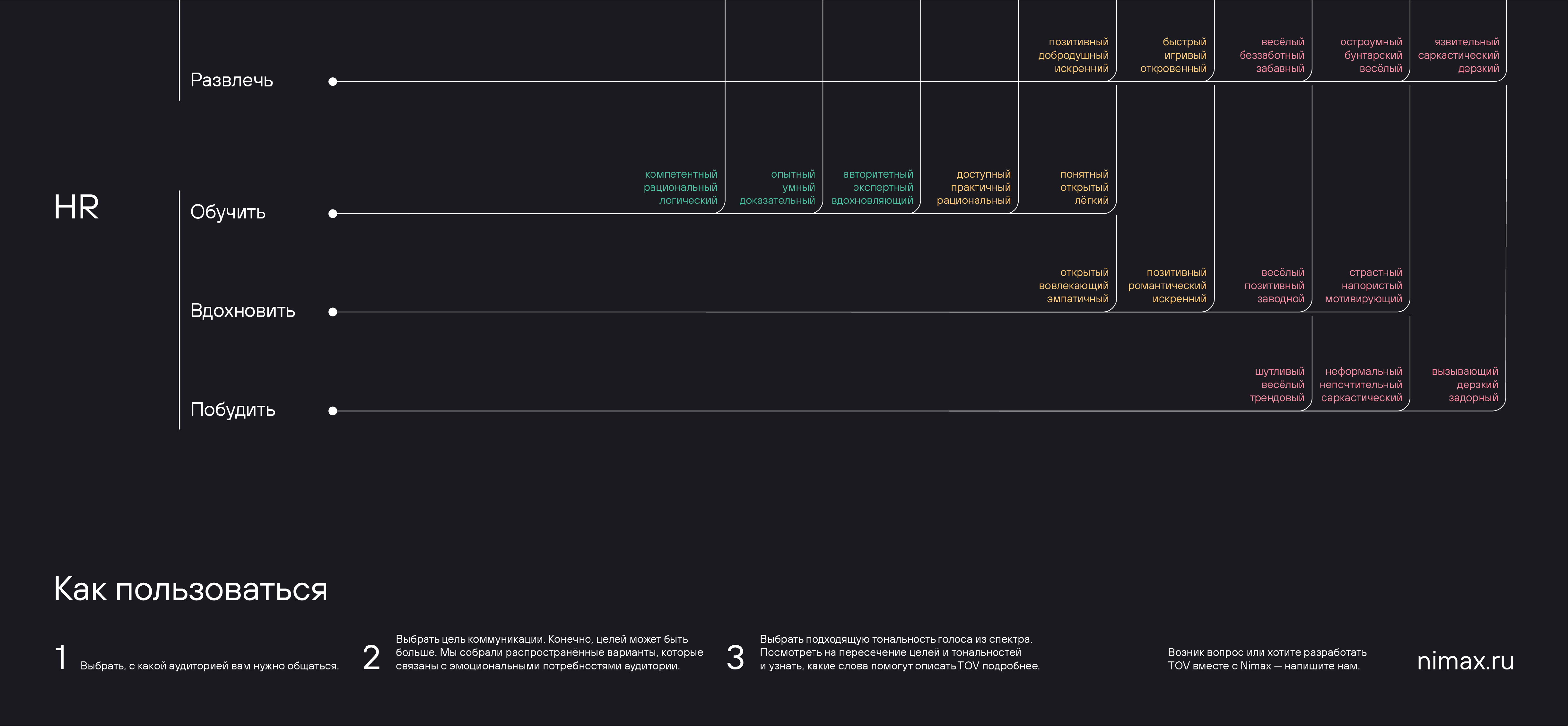Возник вопрос или хотите разработать тональность голоса бренда вместе с Nimax — напишите нам на hello@nimax.ru.