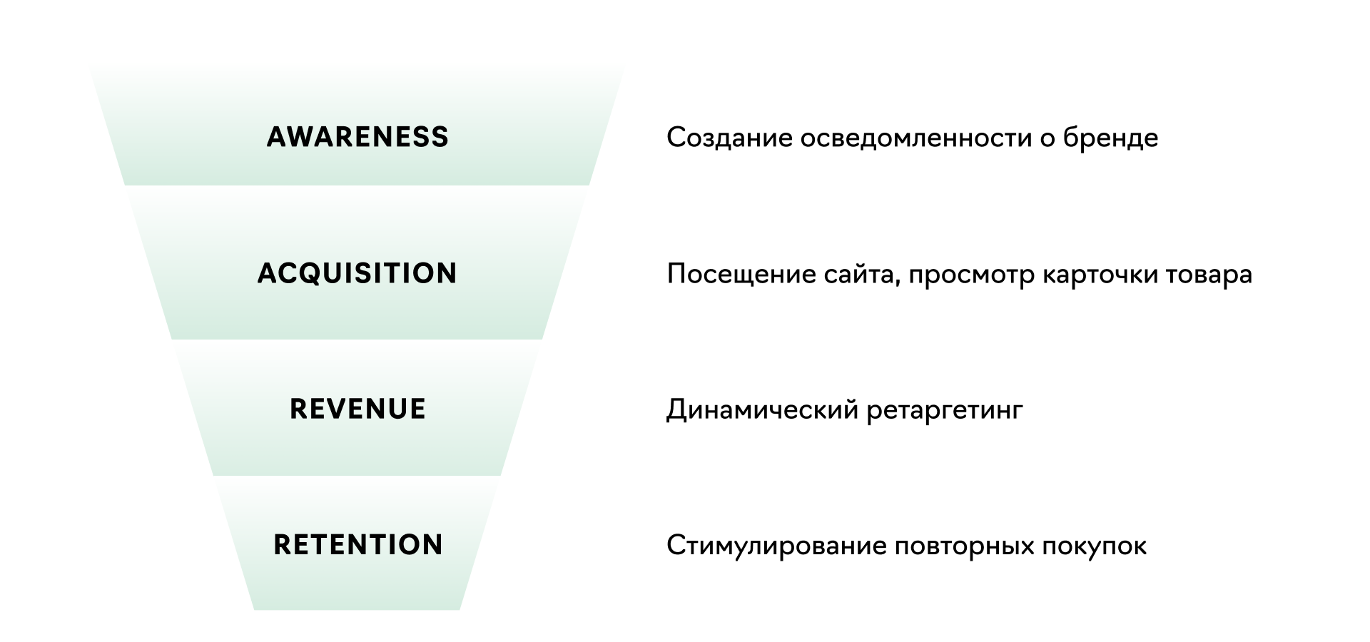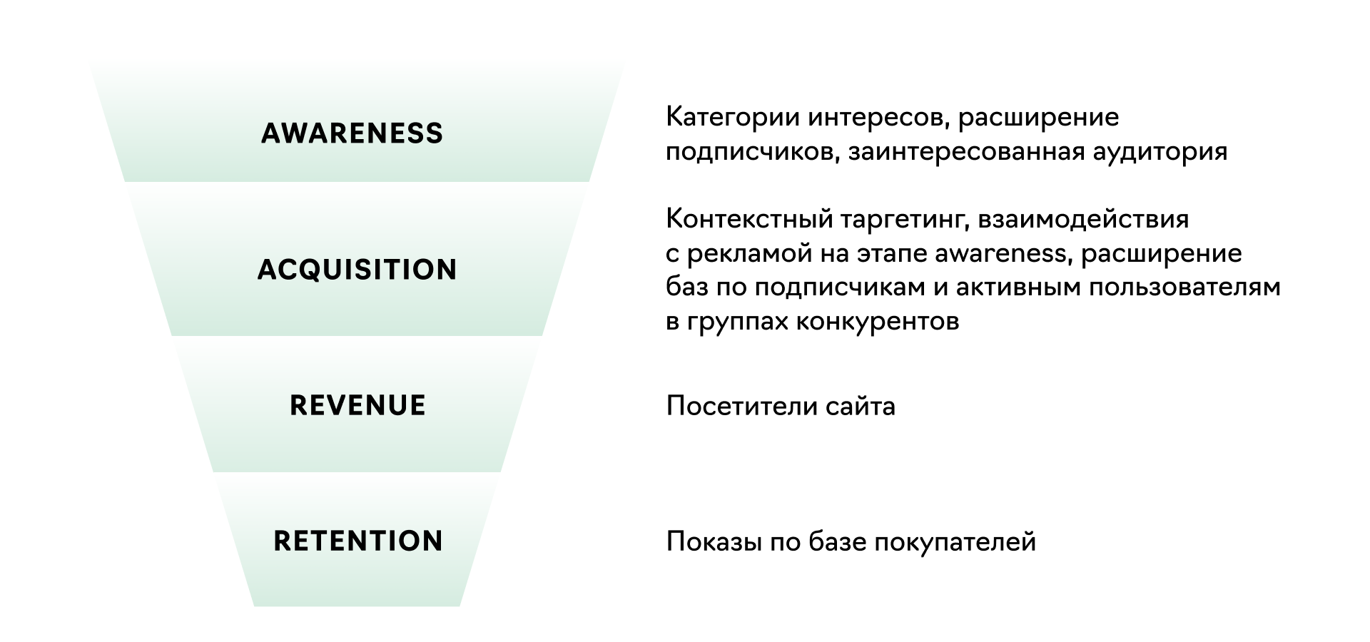 За это отвечают уровни рекламной кампании Revenue и Retention. Верхние этапы воронки Awareness и Acquisition служат для пополнения баз Revenue и Retention.