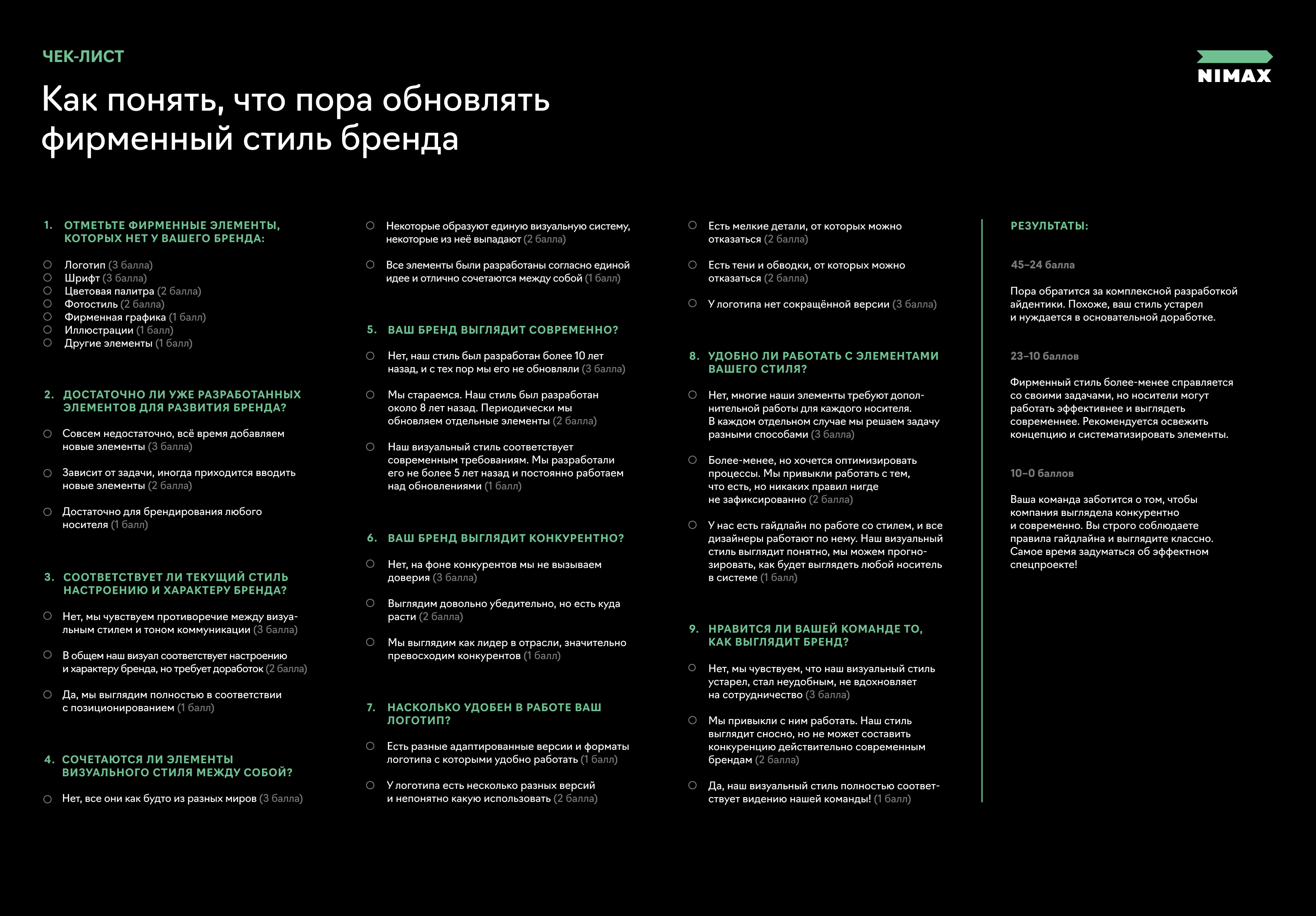 Мы разработали чек-лист, который поможет проанализировать айдентику бренда. Заполните, посчитайте баллы и узнайте, нуждается ли ваш фирменный стиль в обновлении и доработке.