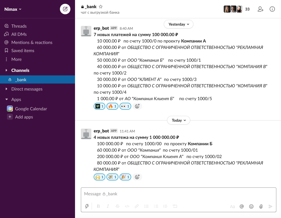 Решили задачу в два шага. Сначала сделали интеграцию, позволяющую выгружать входящие платежи в ERP. После настроили бота в Slack, который присылает оповещения в общий чат и отправляет дополнительные уведомления в личные сообщения менеджеру каждого проекта. Так сократили время на контроль платежей как минимум на час в неделю для каждого менеджера и бухгалтера, что в сумме часов — больше рабочего дня.