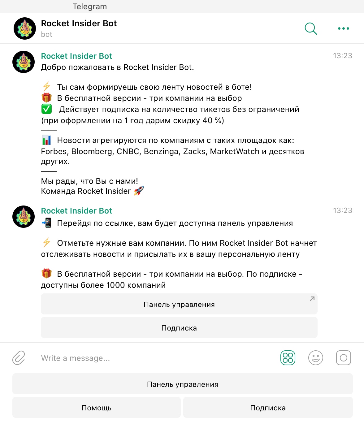 В меню бота добавили панель для управления списком компаний, по которым подбираются новости. Автоперевод новостей на русский язык реализовали с помощью сервиса от Google Translate.
