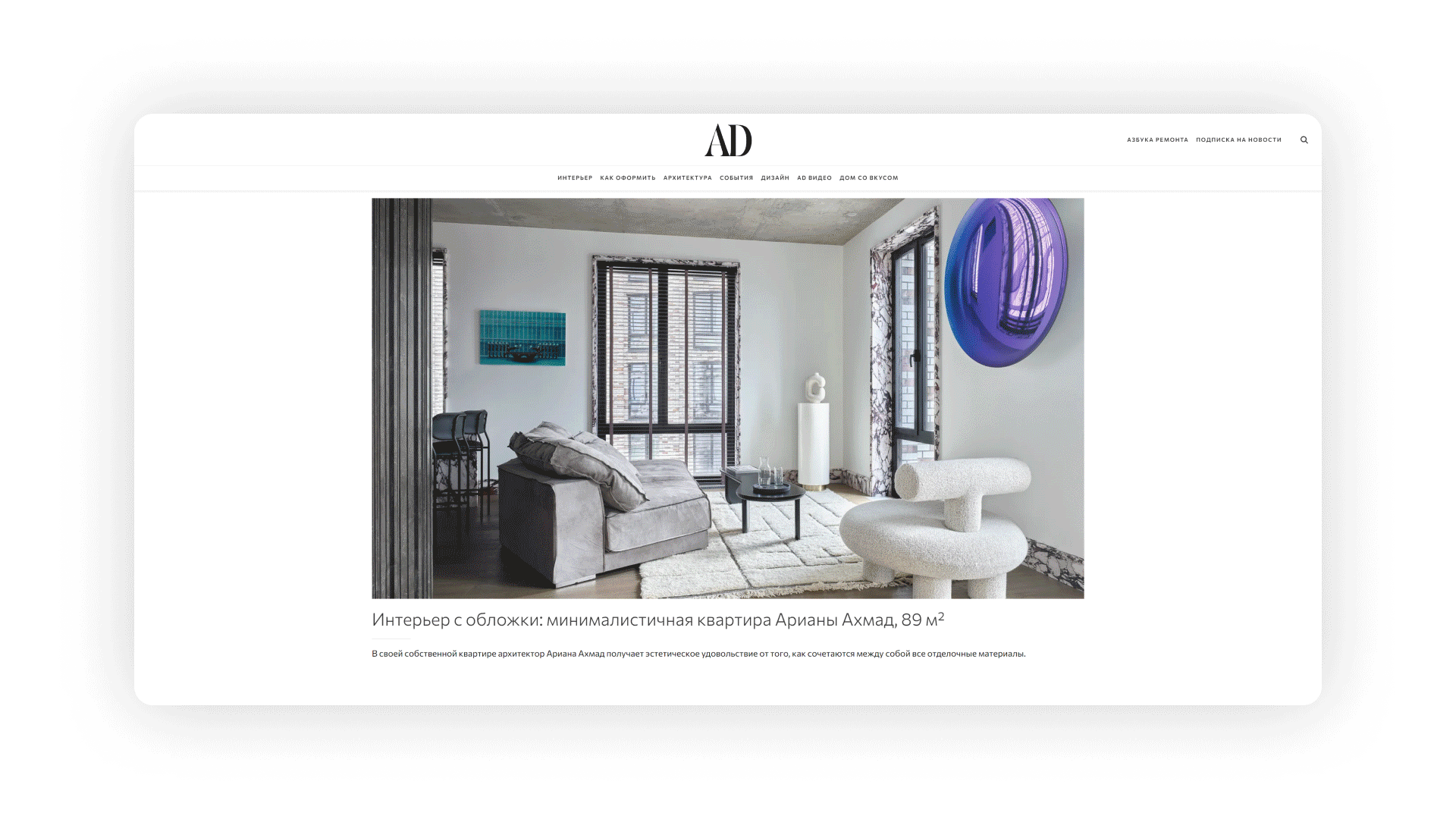 AD (Architectural Digest) — журнал об архитектуре и дизайне интерьеров, рассчитанный как на тех, кто просто интересуется новинками в индустрии, так и на профессионалов своего дела.