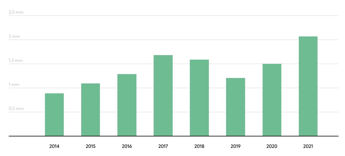 С начала работ в 2014 году мы увеличили трафик сайта в 2,5 раза. В 2021 году поставили рекорд по годовой посещаемости по поисковому трафику.