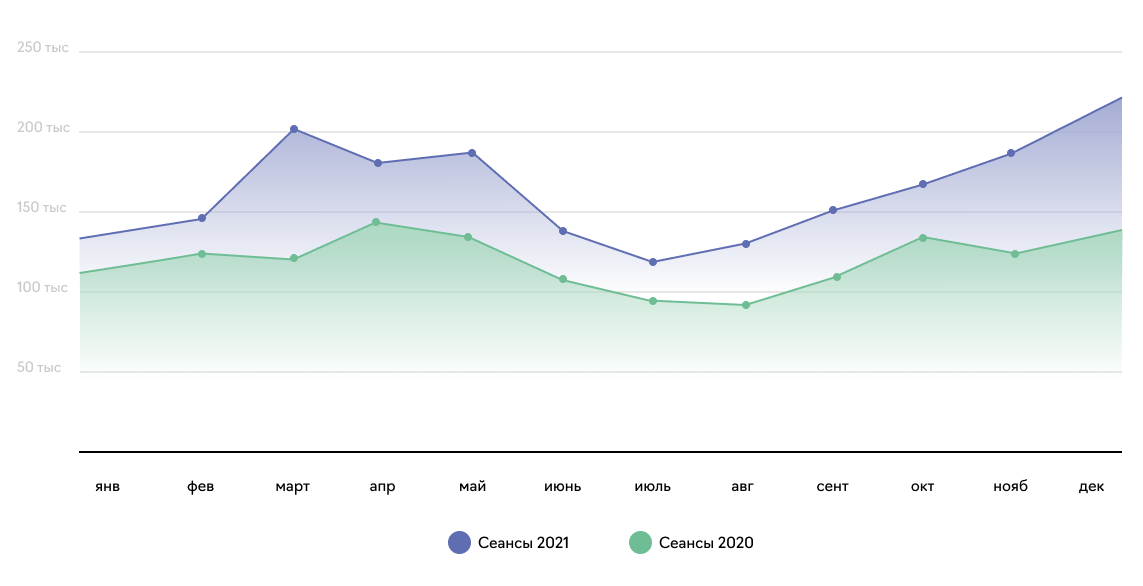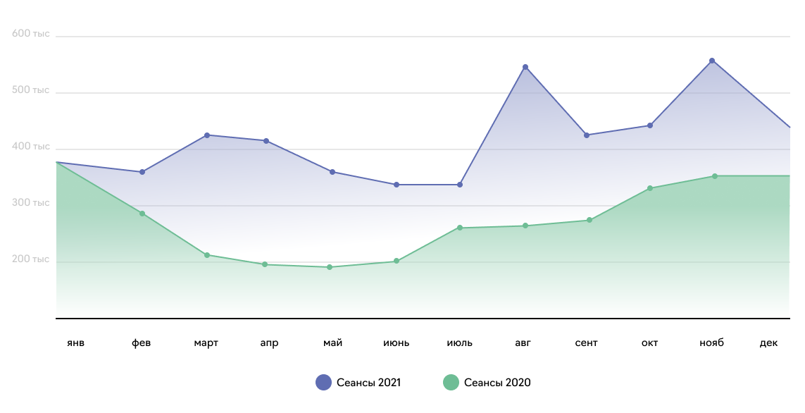Что касается результатов год к году, то прирост органического трафика в 2021 году составил +46% относительно показателей 2020-го года.