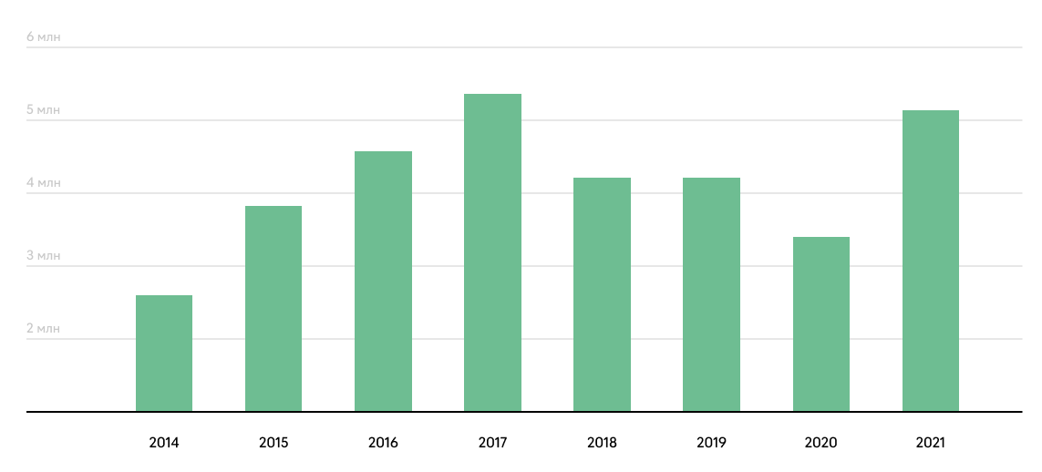 В 2021 году мы выросли на 67% по поисковому трафику относительно прошлого года, а прирост по новой привлеченной аудитории составил +1,5 млн новых пользователей.
