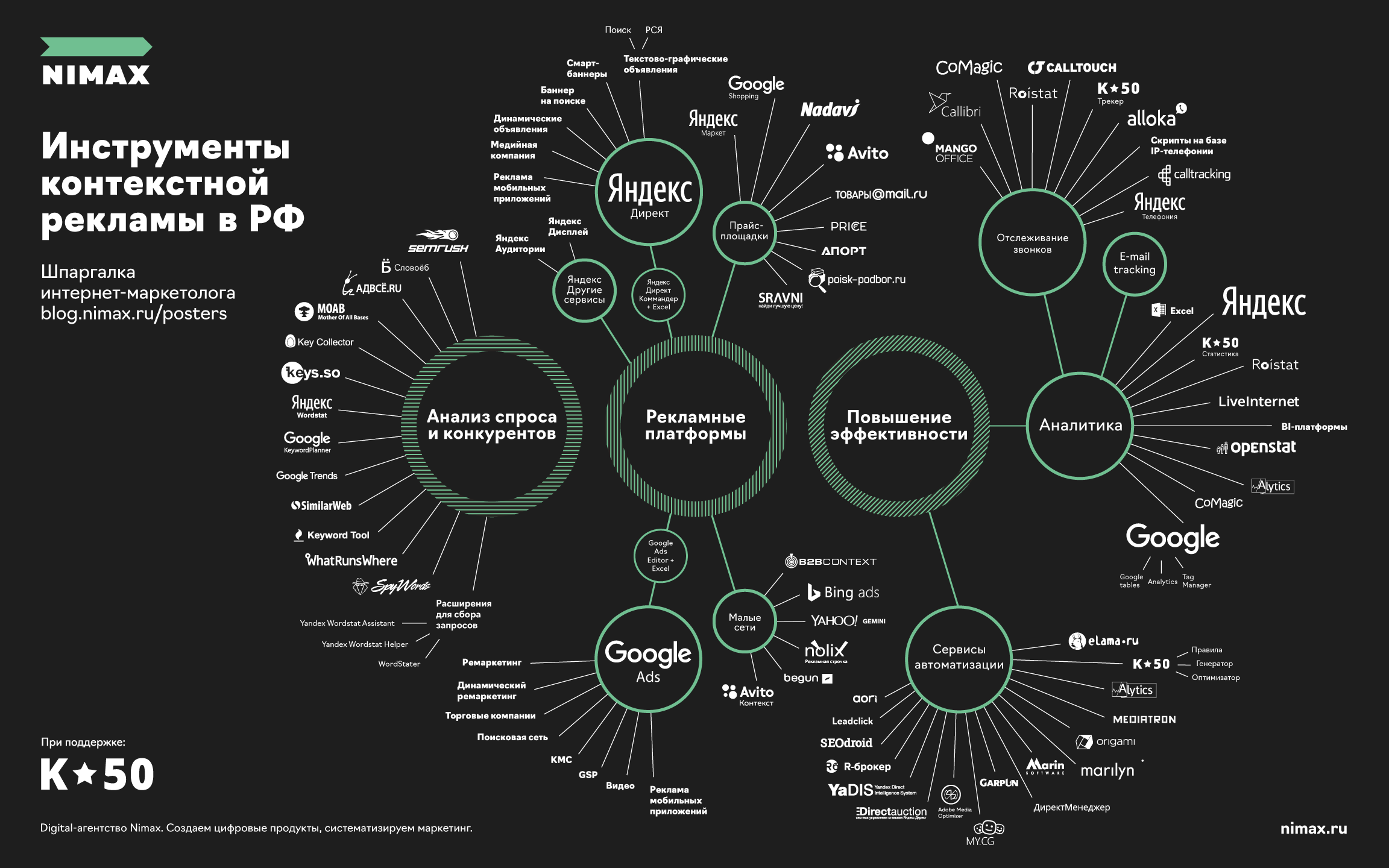 Инструменты, которые используем при работе над контекстной рекламой, показывает наша инфографика: