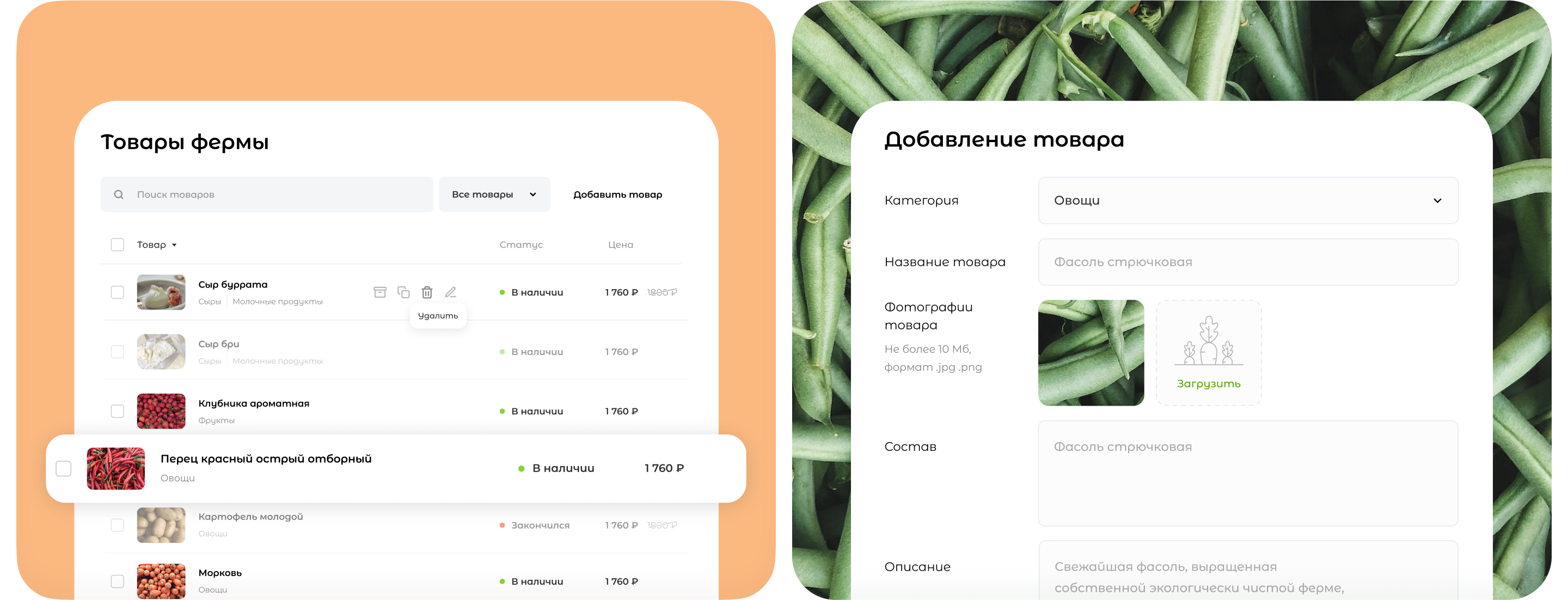 Личный кабинет фермера для управления карточкой продавца и каталогом продукции.