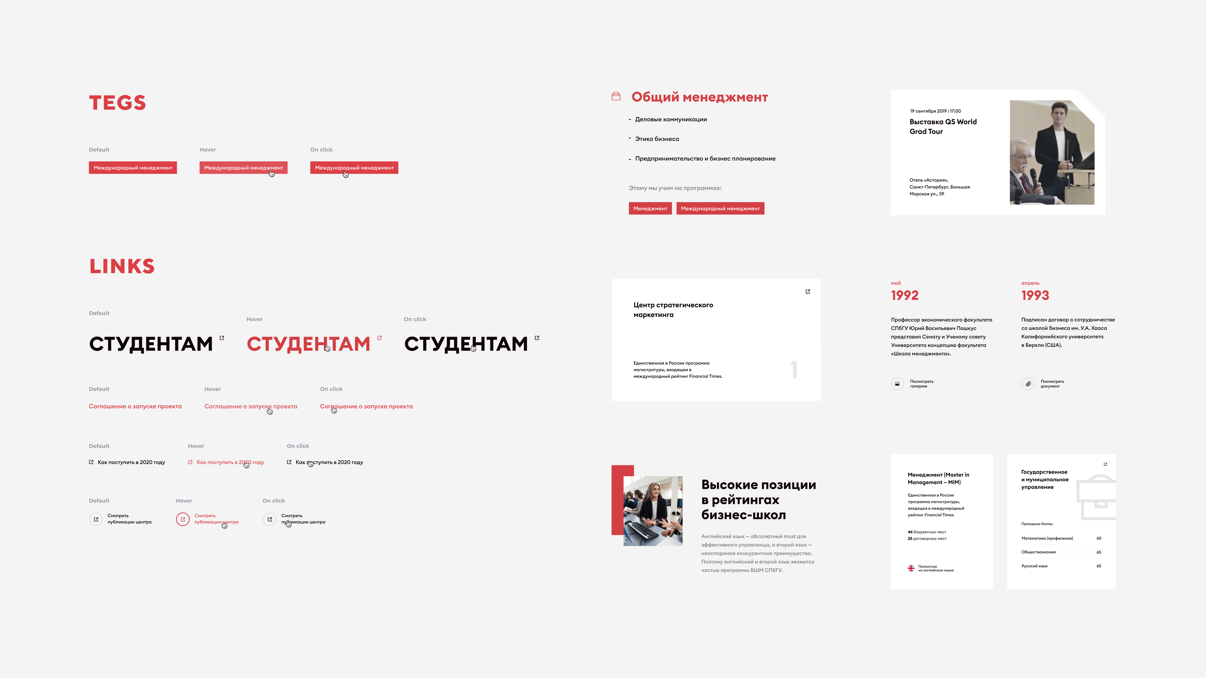 В рамках проекта мы разработали больше тридцати дизайн-макетов. И даже сейчас, уже на стороне клиента, сайт ВШМ СПбГУ постоянно развивается и дополняется. Именно поэтому нам было важно продумать детальный UI-kit: систему шрифтов, навигационные и композиционные элементы, карточки с разными типами контента, кнопки и многое другое.