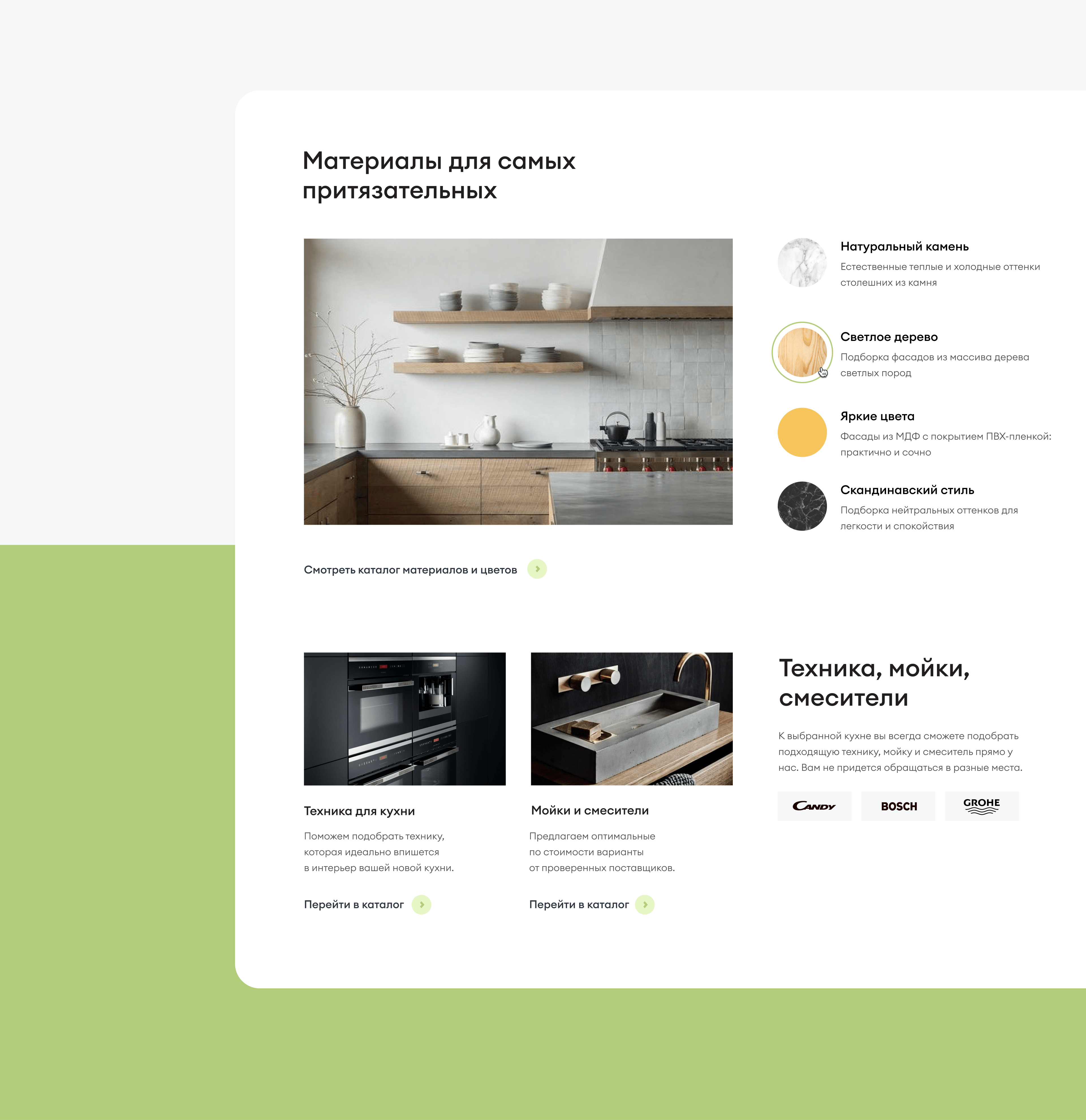 Идея адаптации кухни мечты к пространству дома и образу жизни развивается в айдентике. Дизайн система поддерживается натуральными материалами и природными цветами окружающей среды.