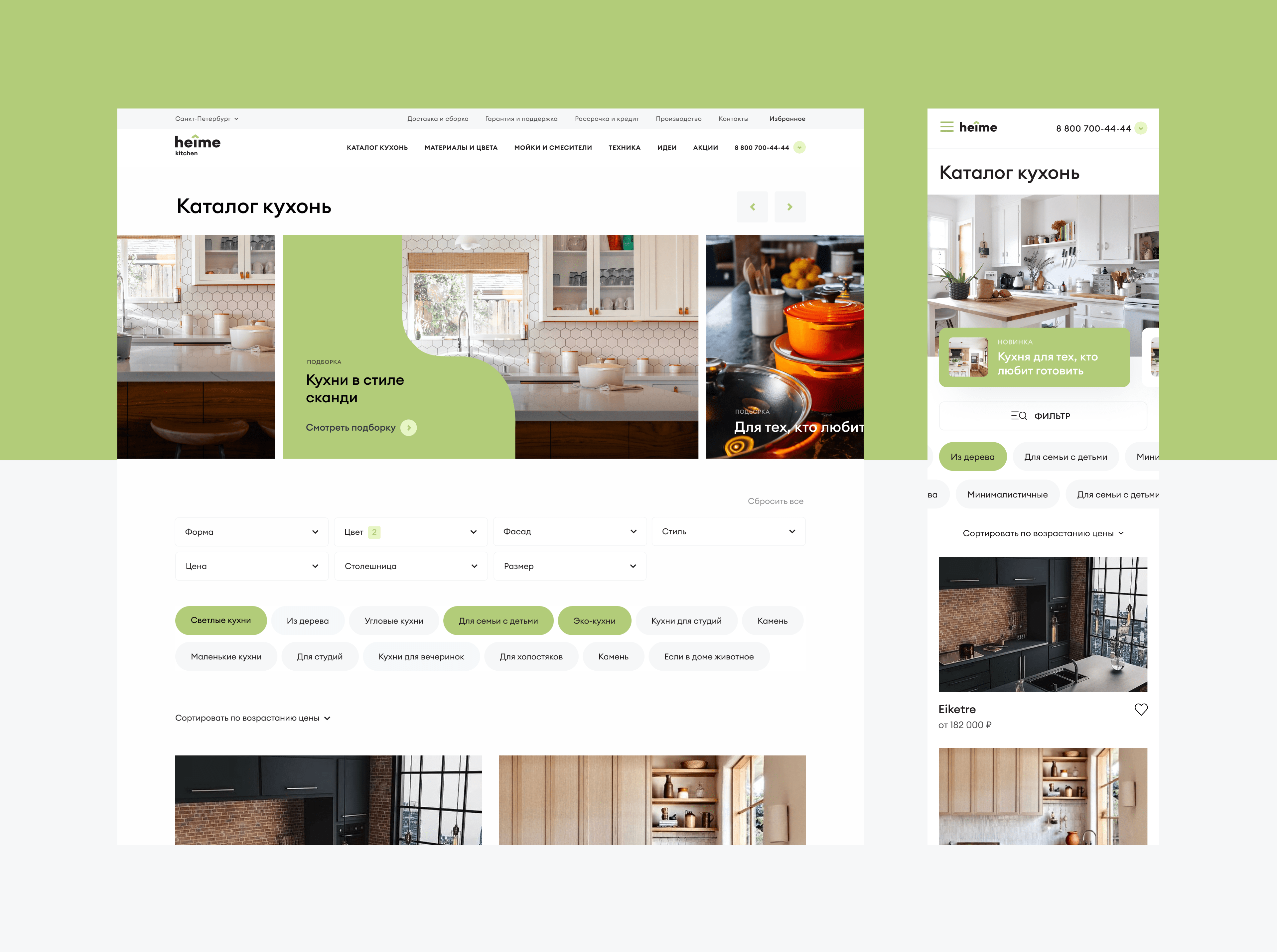 На главной странице сайта рассказываем самое важное: в Heime сделают кухню вашей мечты, а уровень производства и опыт основателей компании обеспечат ее доступность, качество и долговечность.