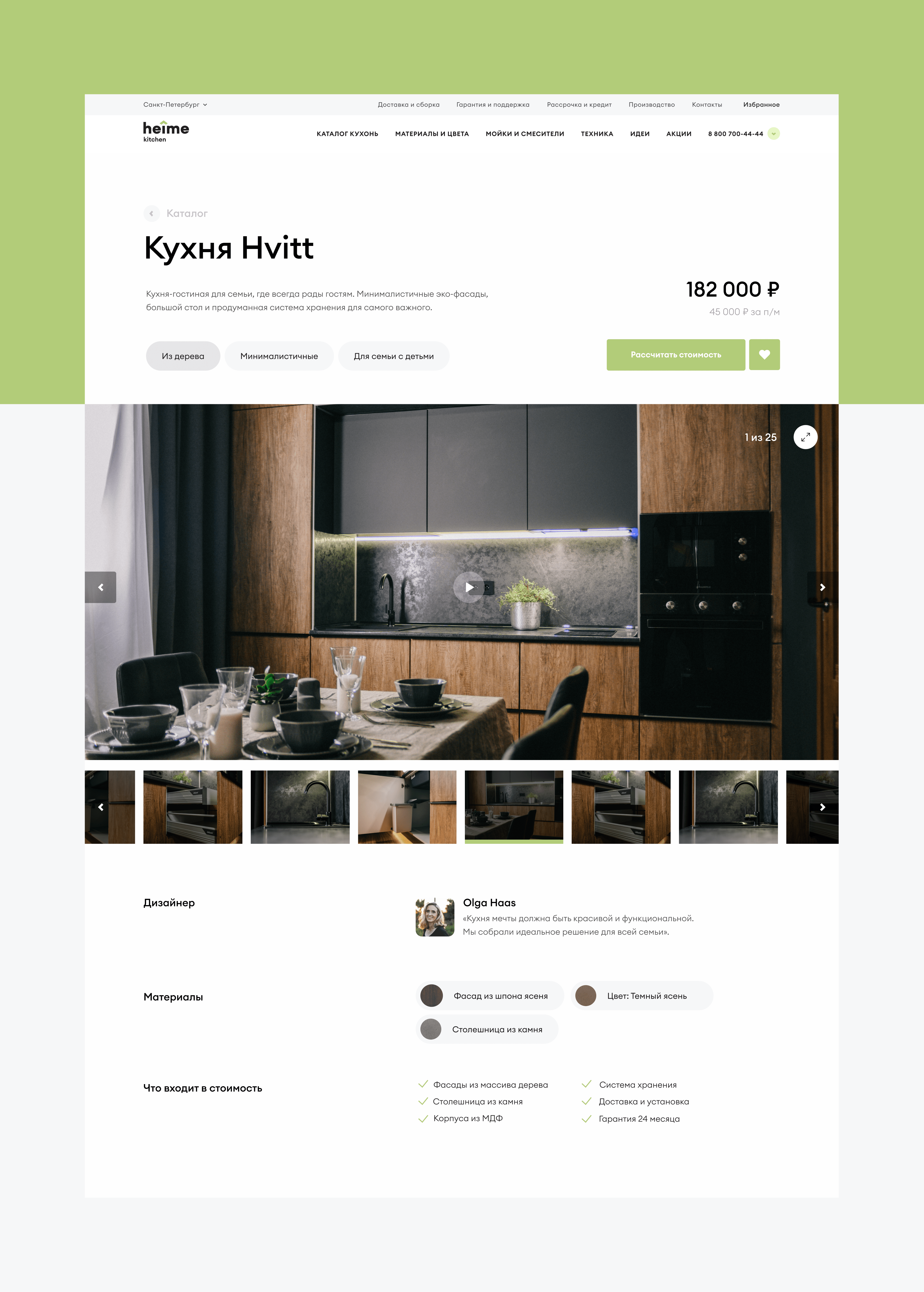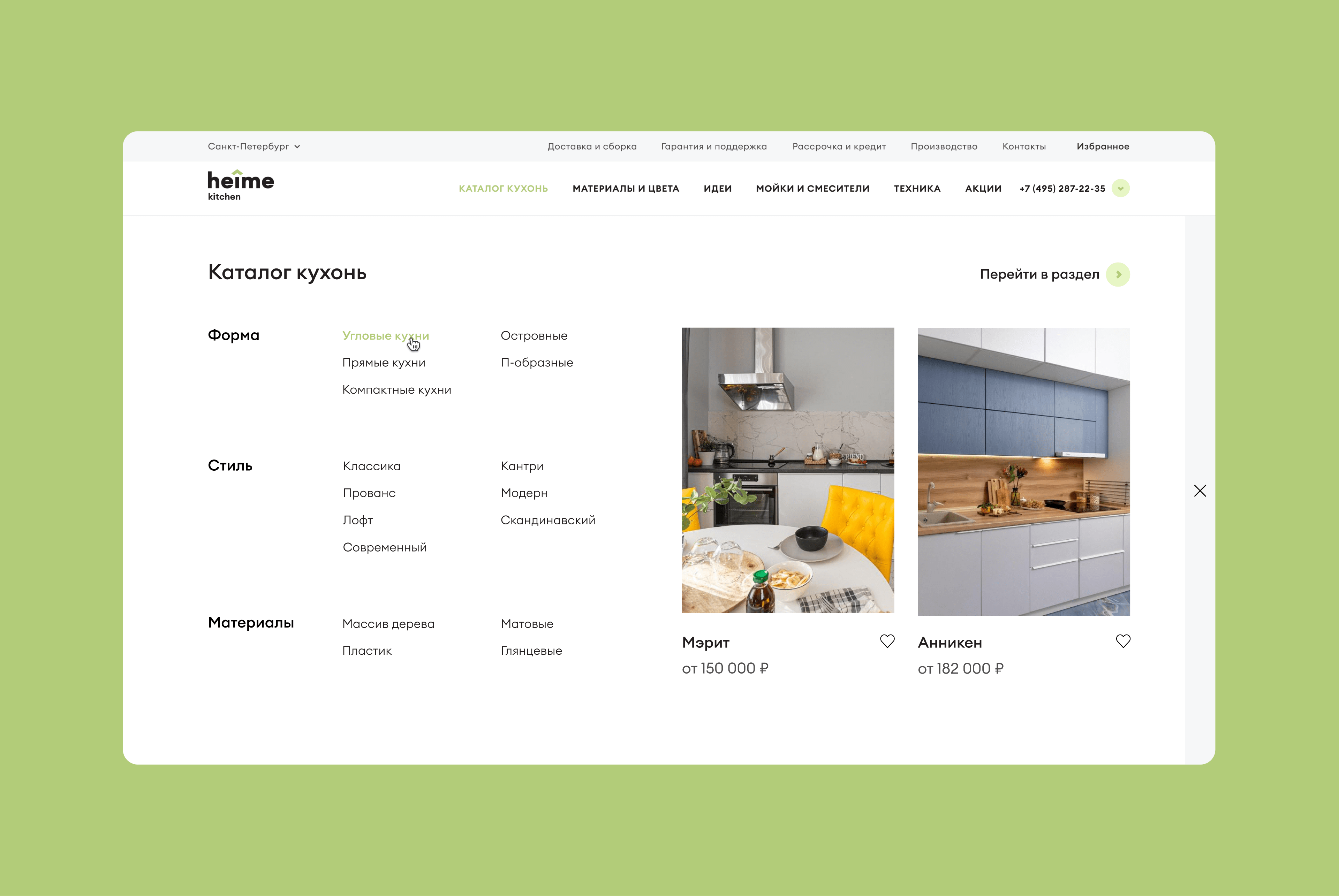 Кухни, материалы, цвета и комплектующие, которые клиенты добавят в избранное — отправятся менеджеру Heime вместе с заявкой.