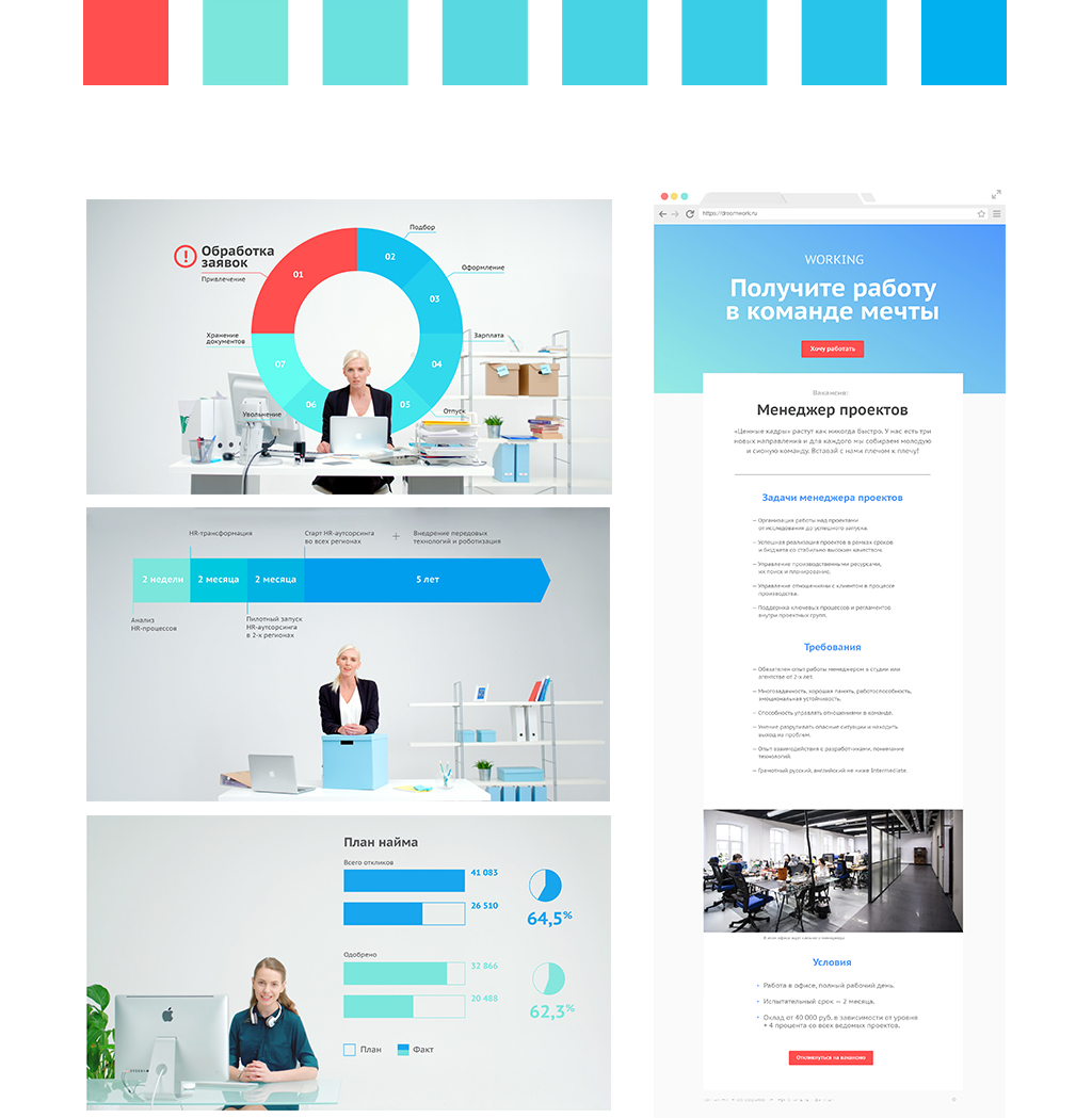 Графику рисуем на основе презентаций и иллюстраций клиента. Пробуем несколько цветовых схем, ищем баланс между детализацией и читаемостью. Придумываем лендинг с вакансией несуществующей компании «Ценные кадры».