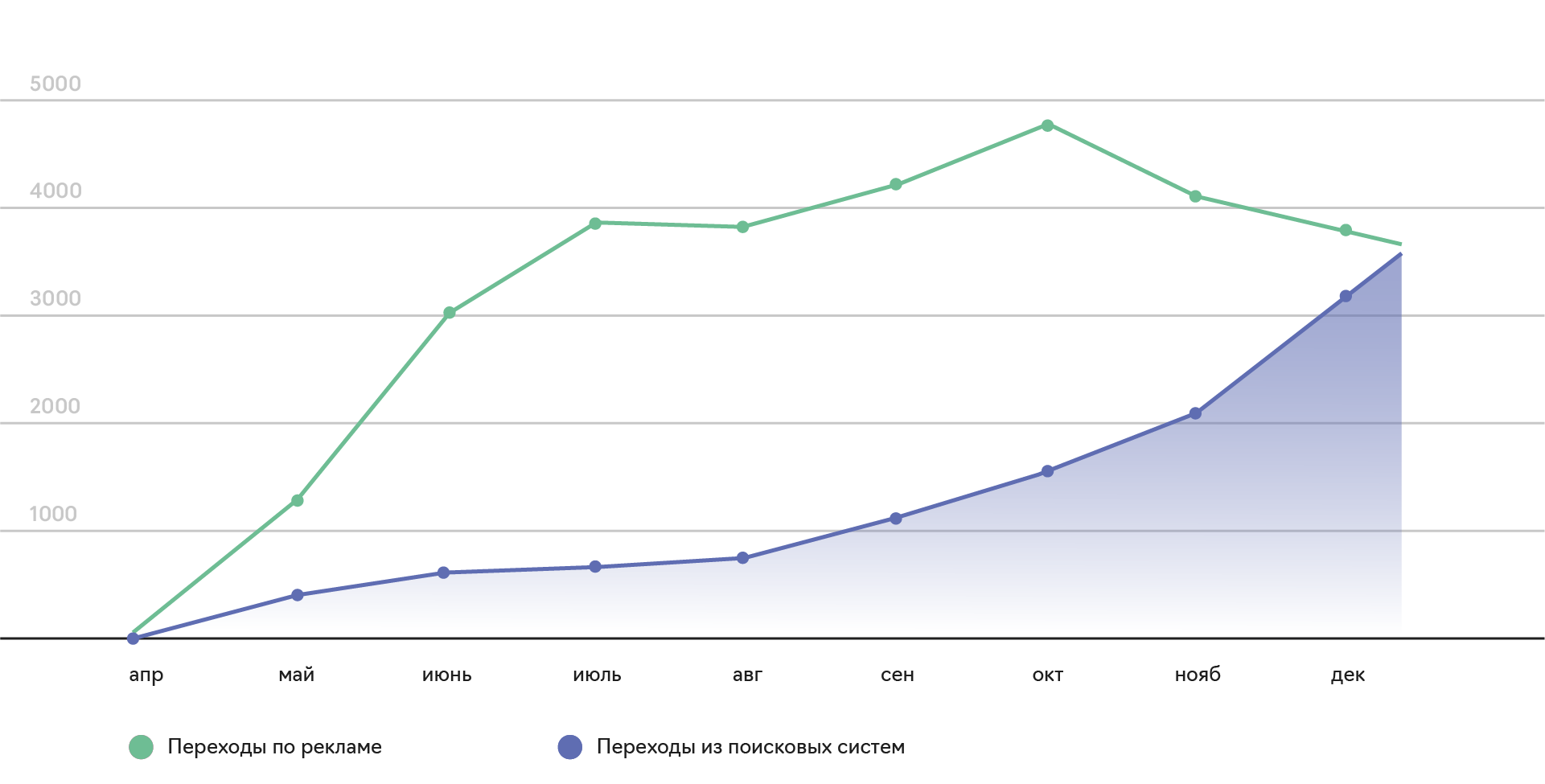 К концу 2020 года мы получили в среднем по четыре тысячи переходов в месяц с контекста и примерно такое же количество с SEO.