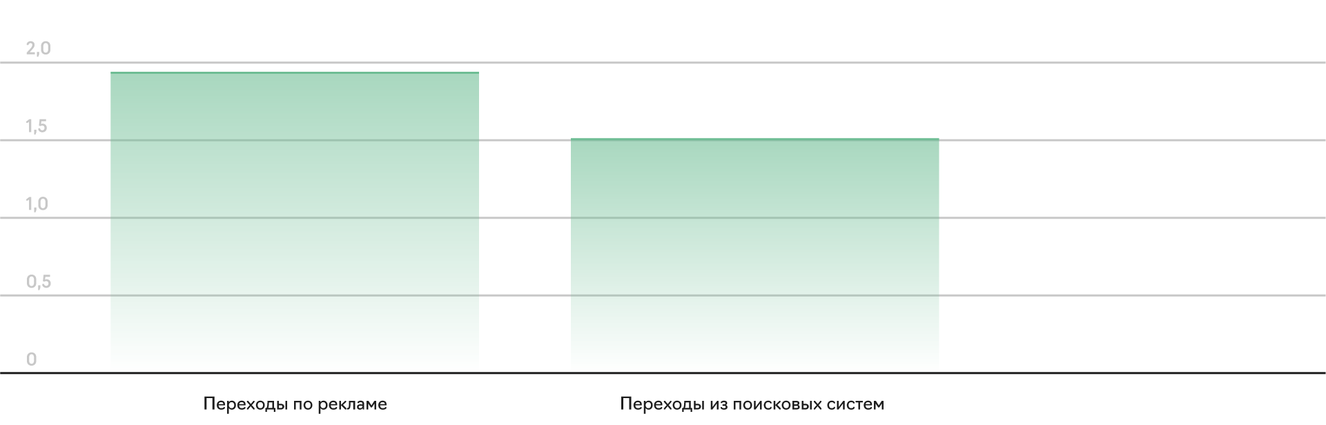 Также мы оцениваем и глубину вовлеченности пользователей. Показатель в среднем составляет 1,9, а с поисковых систем он равен 1,5.