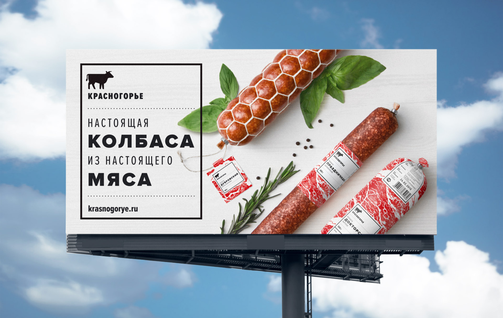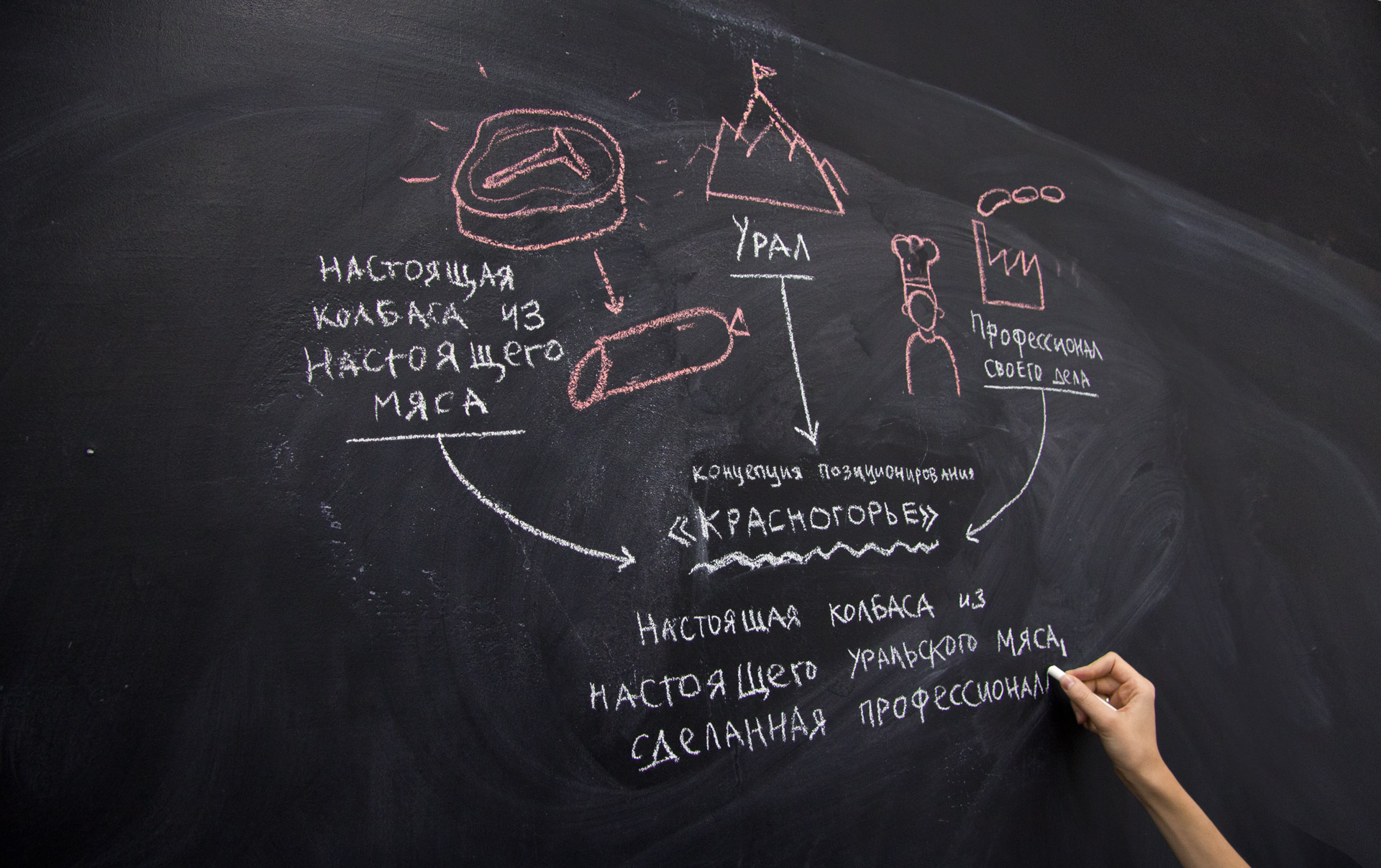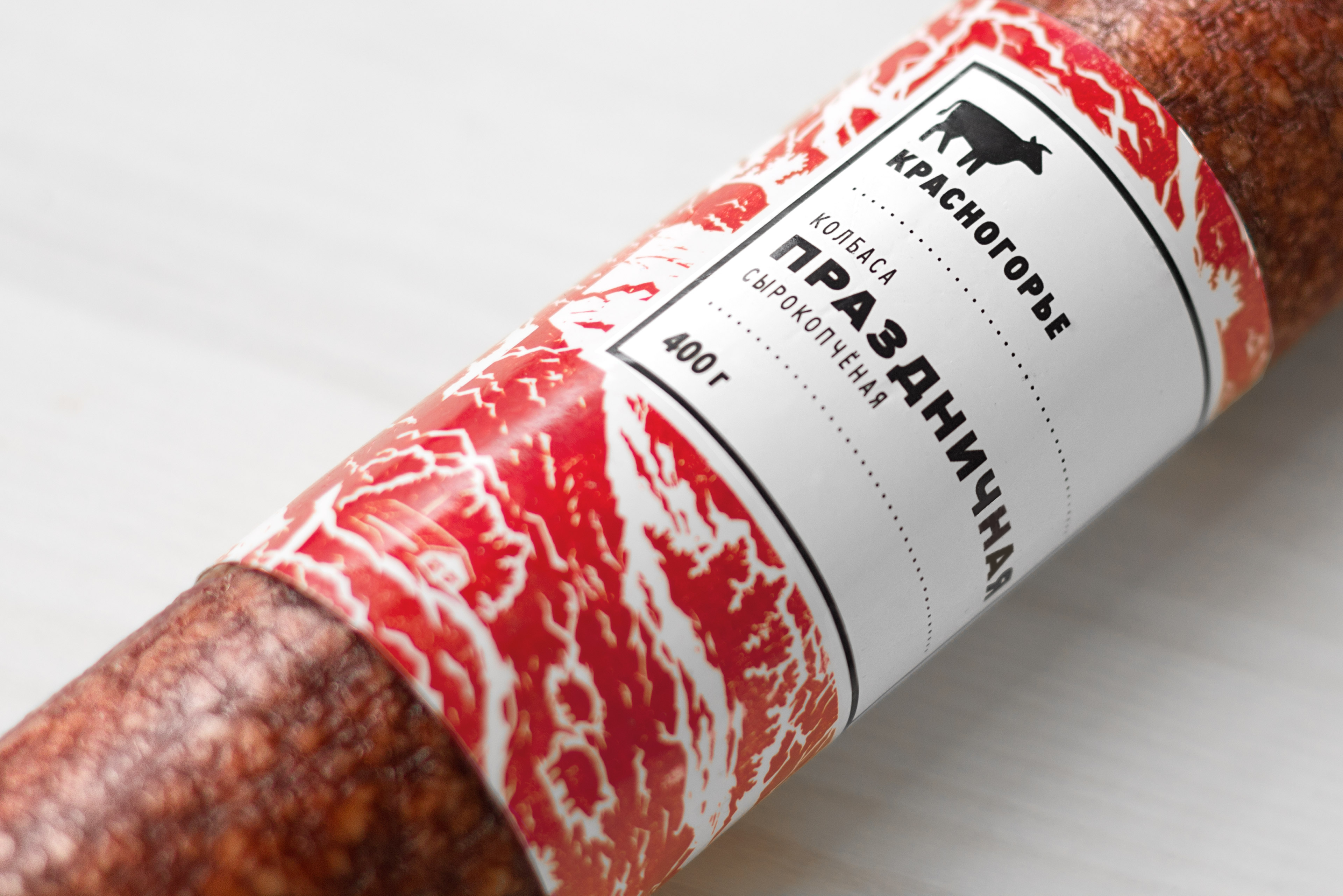 Понимание специфики производственного процесса, особенностей рецептуры и отношения производителей к своему делу помогло нам сформулировать простую и честную концепцию позиционирования бренда. «Красногорье» — это колбаса из настоящего уральского мяса. С этой формулировкой мы приступили к поиску идеи для оформления упаковочной линейки.