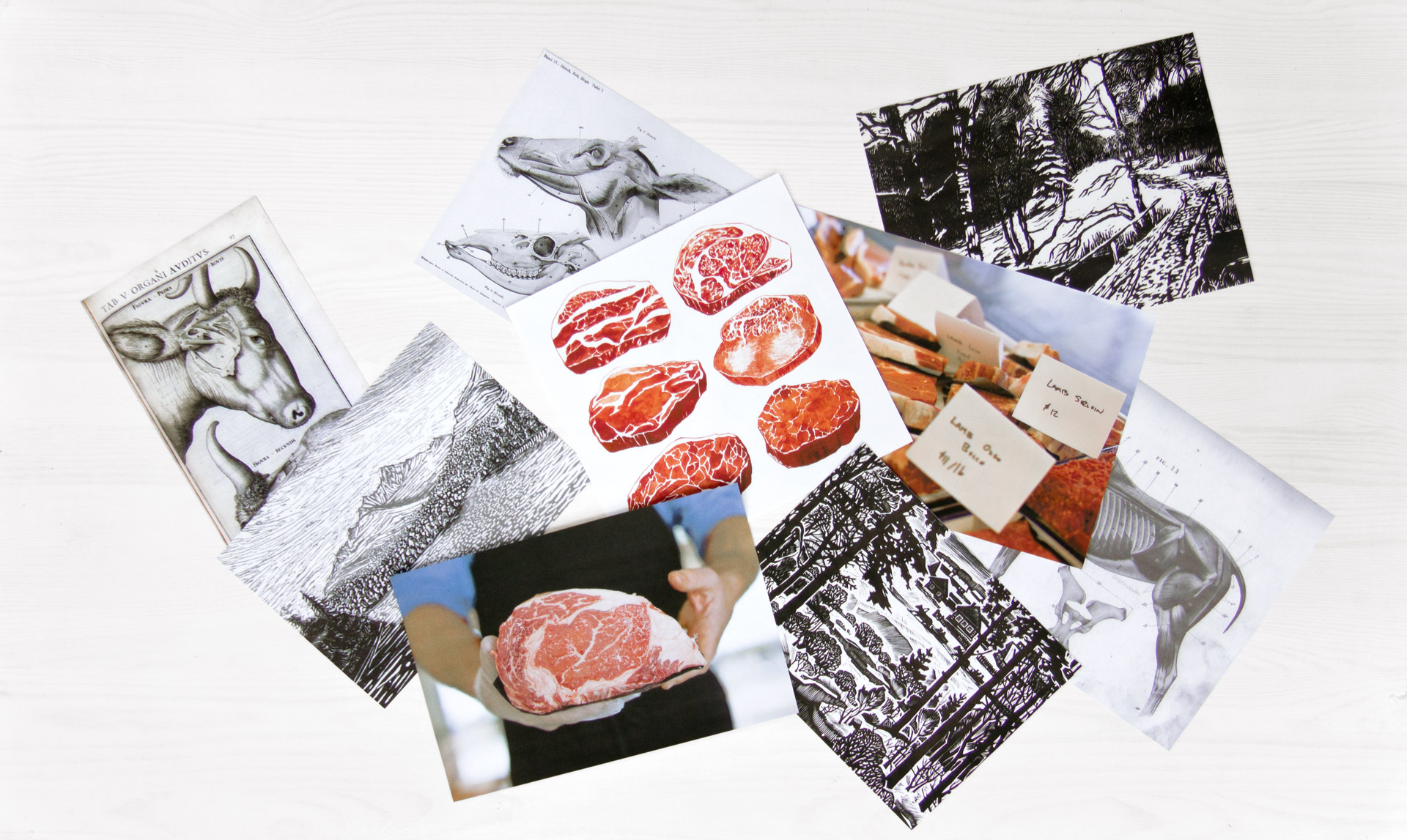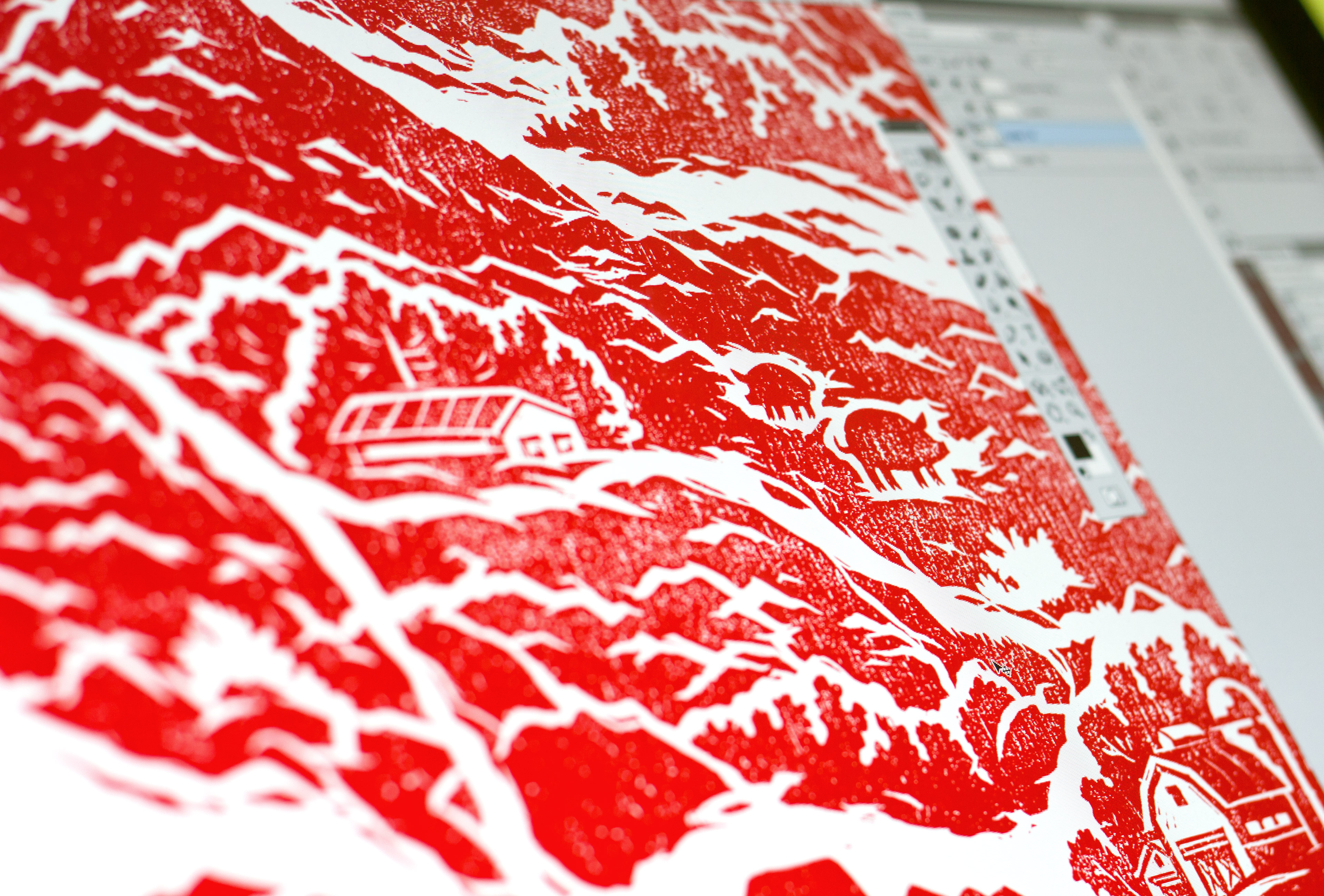 Еще на этапе работы над концепцией мы решили, что фоновая иллюстрация упаковки должна быть выполнена в аналоговой технике, которая идейно перекликается с концепцией позиционирования колбасы из настоящего мяса. Перебрав возможные варианты, мы остановились на технике линогравюры.