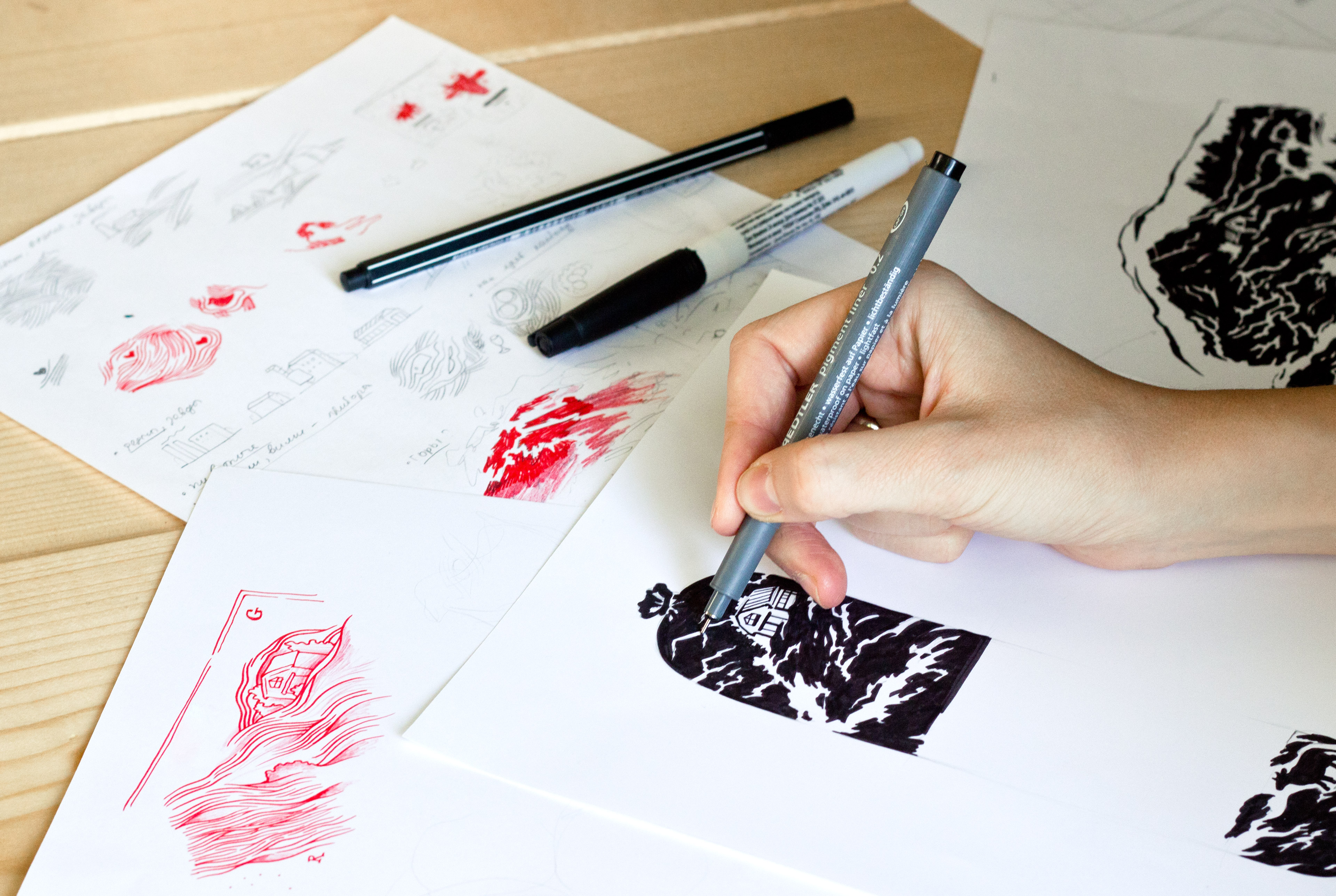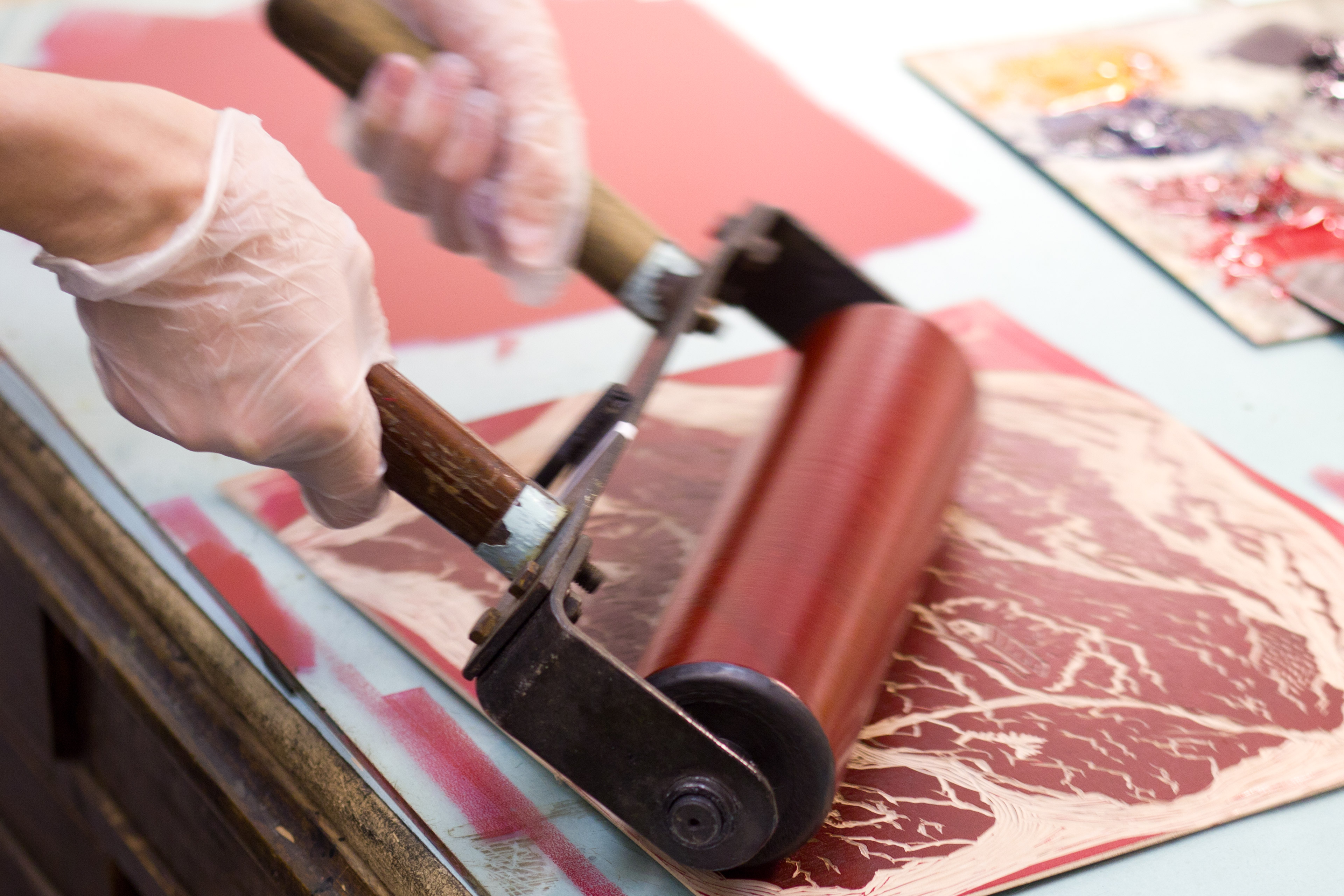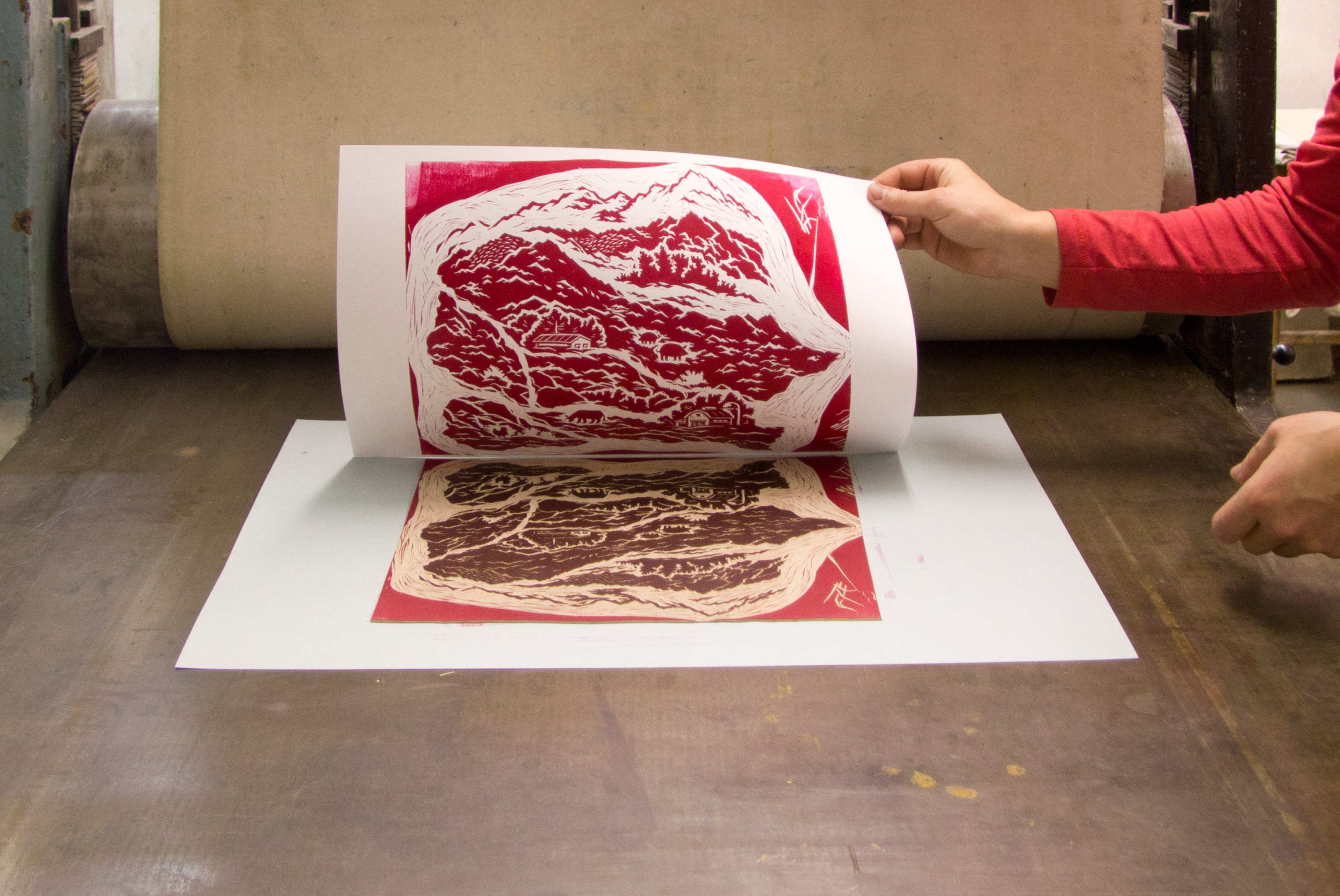 Самым сложным оказалось найти печатную мастерскую со специальным офортным станком для печати оттисков. Попробовали несколько фактур бумаги, смешали и накатали нужный оттенок красного и в итоге сделали идеальный оттиск.