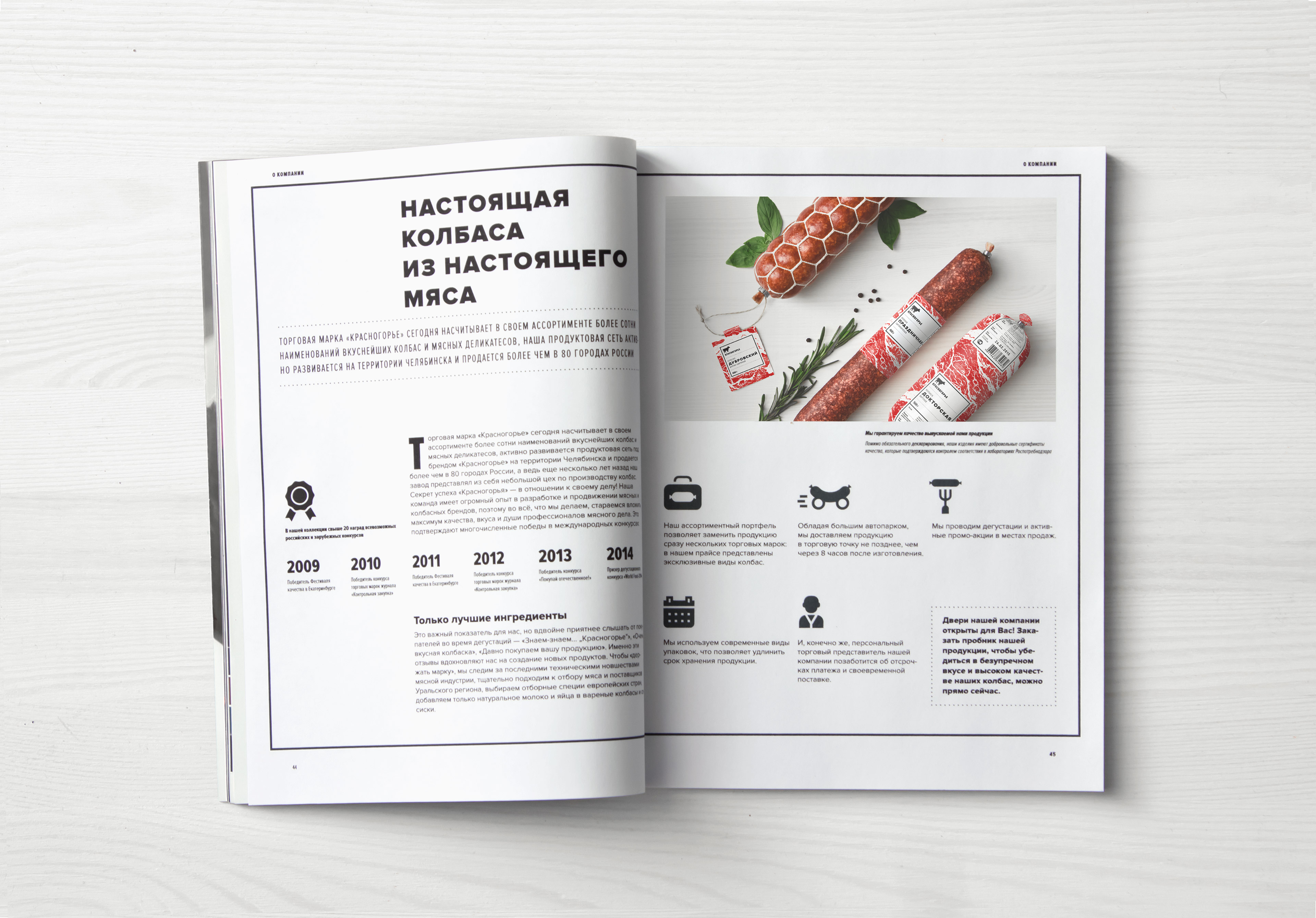 Информационные и рекламные материалы «Красногорья» верстаются по тем же простым правилам, что и этикетки продукции. Аскетичная верстка дополняется небольшими графическими элементами — черной рамкой, пунктирными разделителями и плашечными пиктограммами, иллюстрирующими преимущества компании и ее продукции. С помощью этих элементов мы достигаем композиционного разнообразия без потери единой структуры верстки.