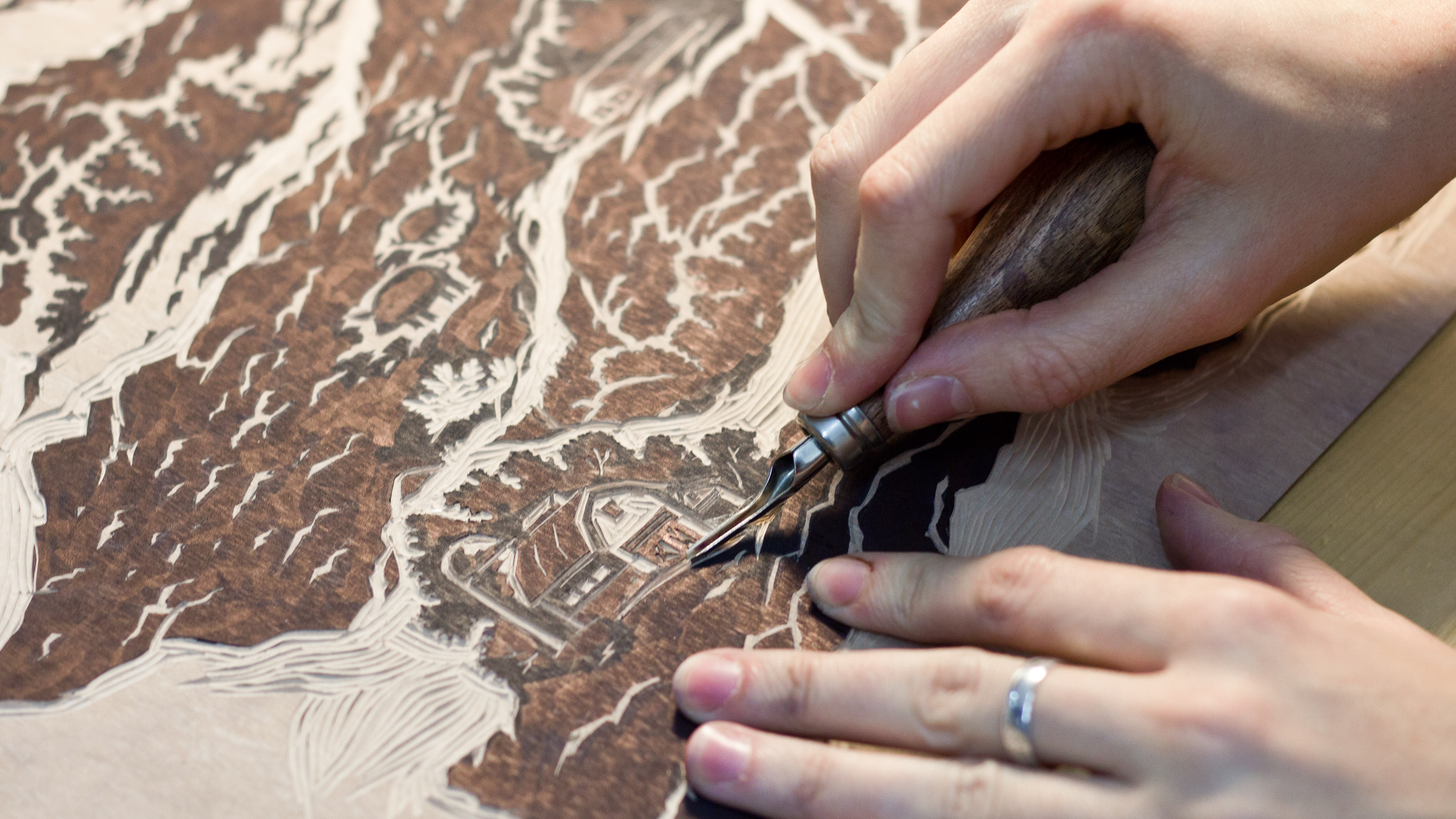 Создание линогравюры оказалось довольно трудоемким. Мы нашли все необходимые материалы и инструменты, отрисовали финальный эскиз иллюстрации на бумаге и с помощью кальки перевели его на гомогенный линолеум. Процесс вырезания стал самым длительным этапом, заняв почти три рабочих дня.