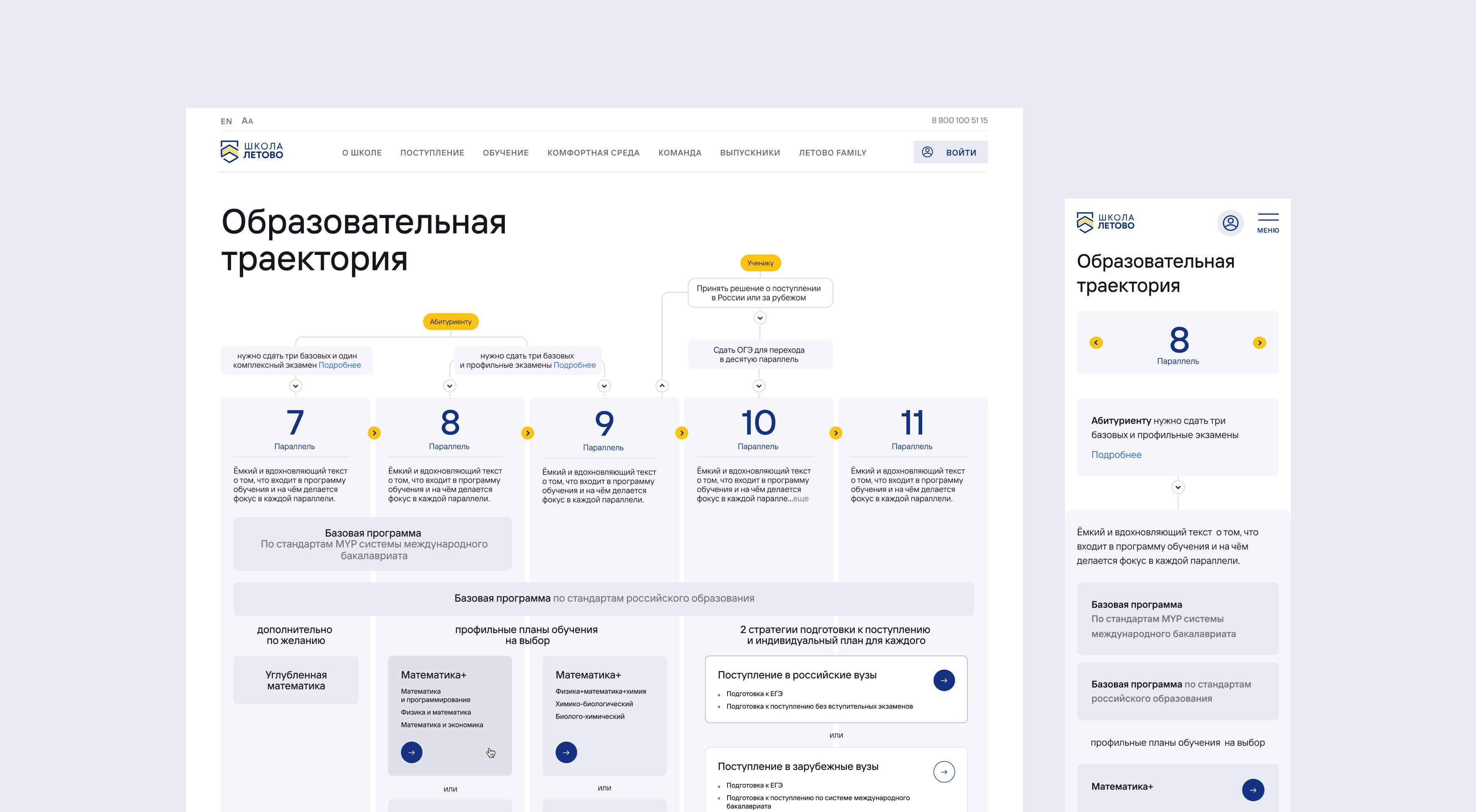Создали для школы «Летово» дизайн-систему, которая объединяет конструктор блоков, ключевые страницы и личный кабинет абитуриента. Сделали структуру сайта легче. Проработали путь пользователя от регистрации в личном кабинете до подачи заявки на поступление и прохождения финального собеседования с учителями школы. Верстку и разработку сайта взяла на себя команда клиента.