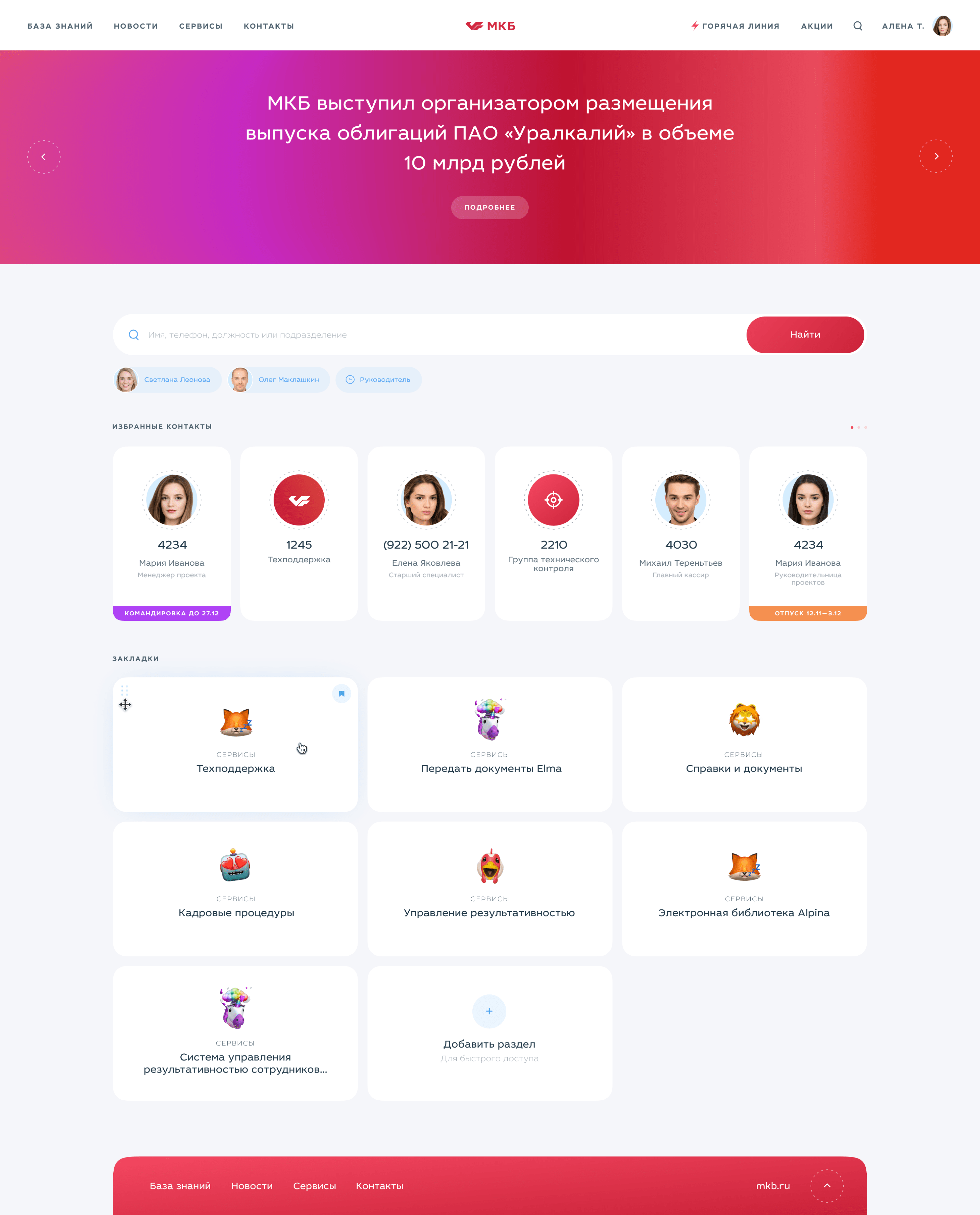 На главную вывели блок с закладками и избранные контакты. Например, большая часть сотрудников постоянно использует внутренние номера, поэтому вынесли их в отдельный акцентный блок. Кто-то часто бронирует переговорку. Кому-то важно иметь под рукой определенную информацию или документ. Любой раздел в структуре можно добавить в закладку, поэтому все частые запросы доступны одним кликом с главной.