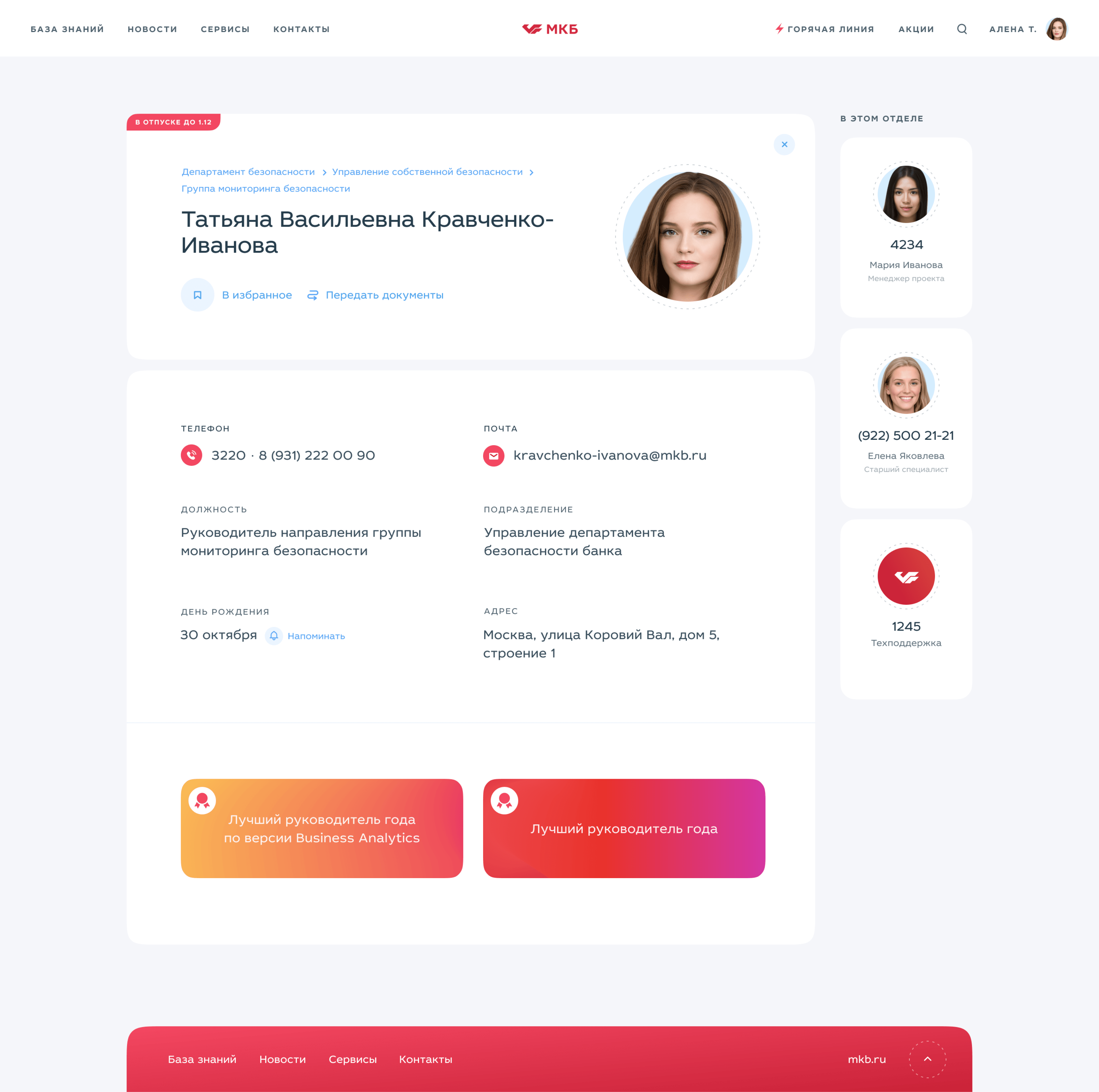 МКБ хотели, чтобы сотрудники не пропускали важные события в компании. Но при этом не хотелось выводить скучный типичный блок «Новости компании». Мы поместили на главную цветной баннер, куда выводим новость дня. У новости нет фото, чтобы не уходило много сил на оформление. Но мы подготовили много вариантов градиентного фона, чтобы баннер не надоедал. Осталось только кликнуть, чтобы прочитать подробнее. Или как минимум узнать основную мысль из заголовка.