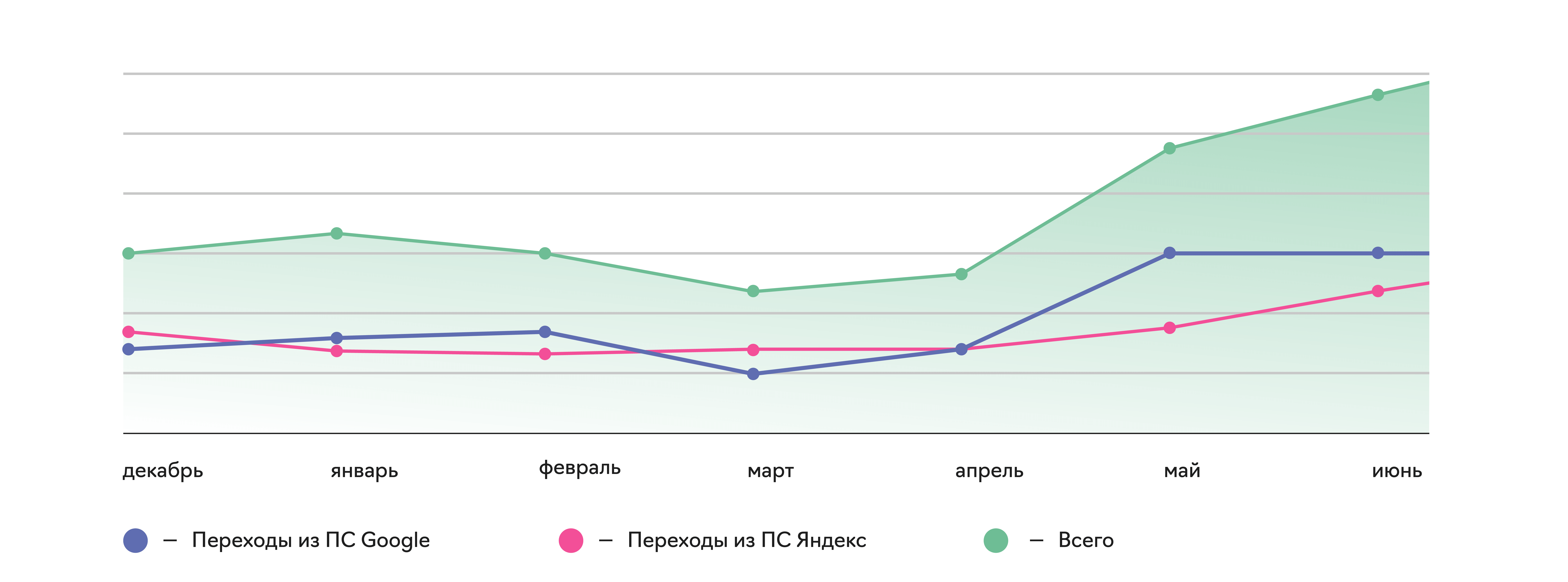 Наша задача — избежать снижения посещаемости при разработке нового сайта, а также увеличить долю органического трафика. Для этого мы подготовили рекомендации по SEO-оптимизации, курировали их внедрения, а после запуска сайта продолжили работу по привлечению органического трафика.