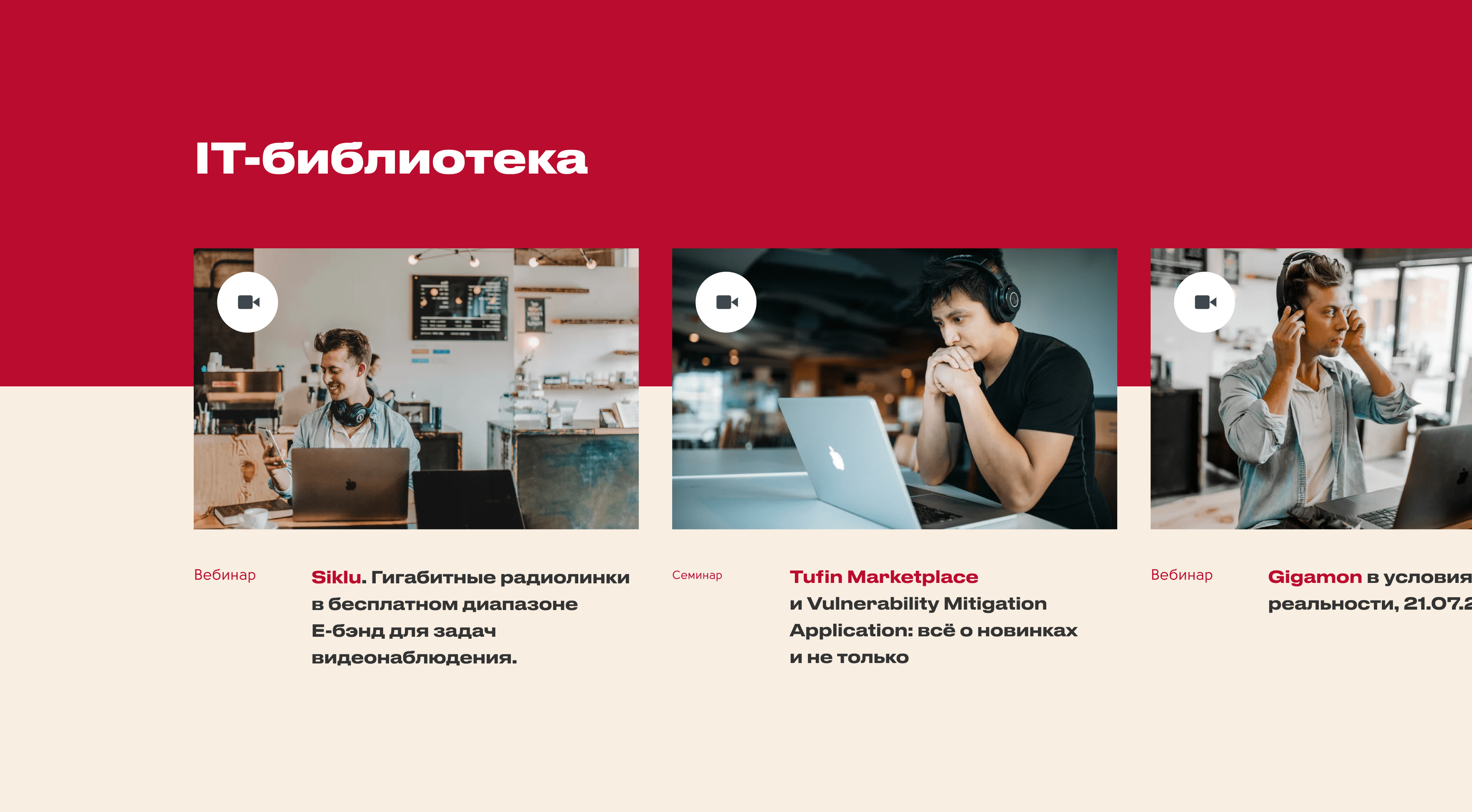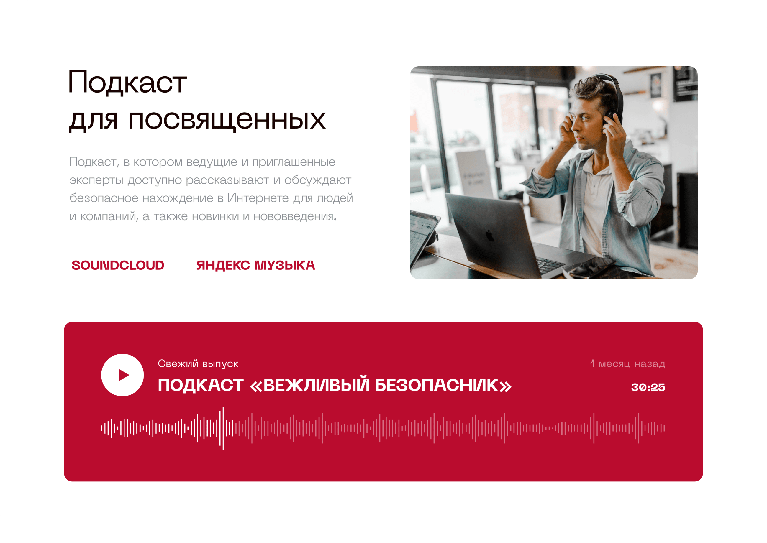 Крупные блоки с видео, подкастами и материалами библиотеки раскрывают идею заботы о клиентах.