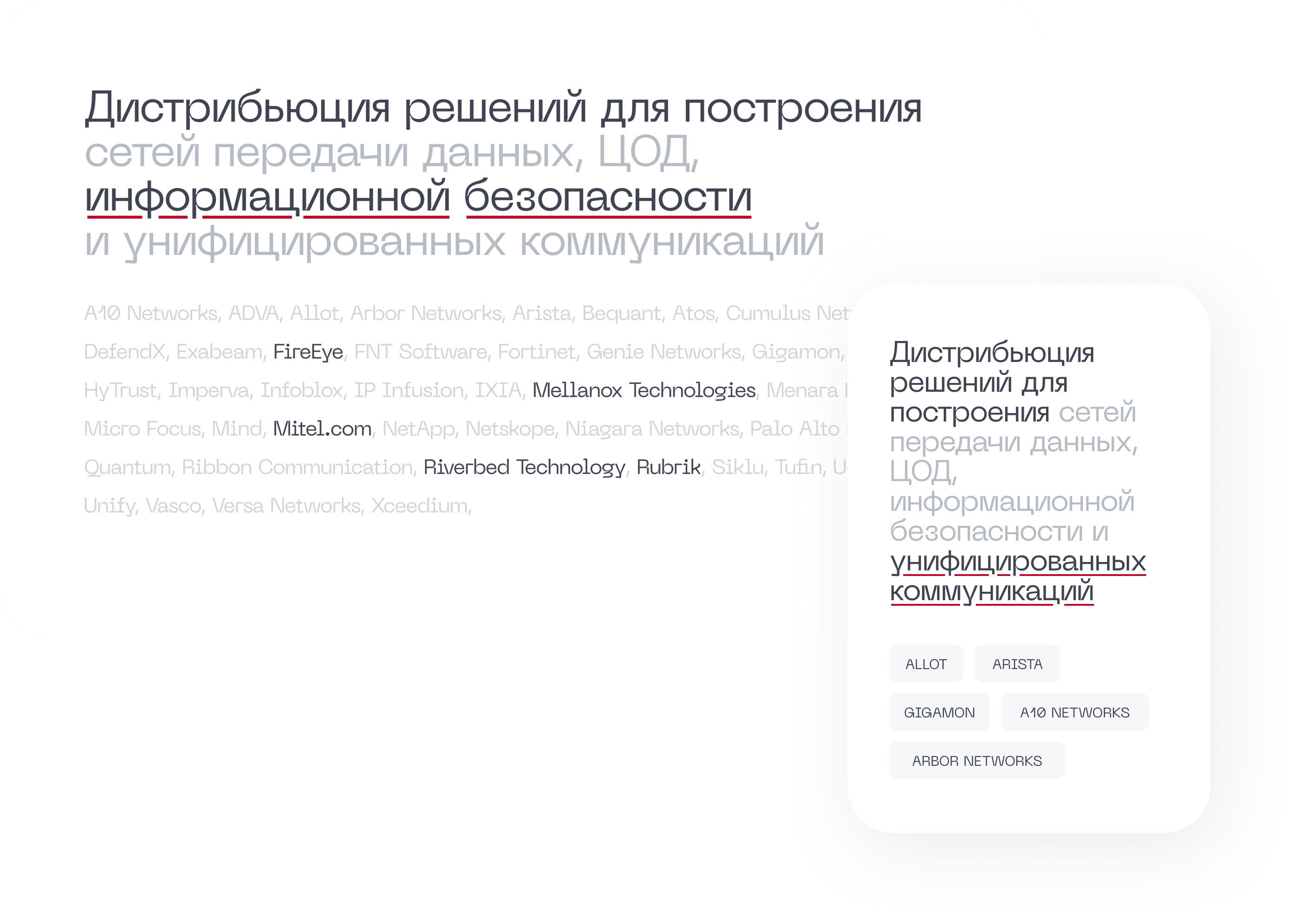 Масштаб компании в этой концепции показали через вендоров. Поставщики оборудования представлены на главной крупным интерактивным списком с разбивкой по четырем направлениям бизнеса компании.