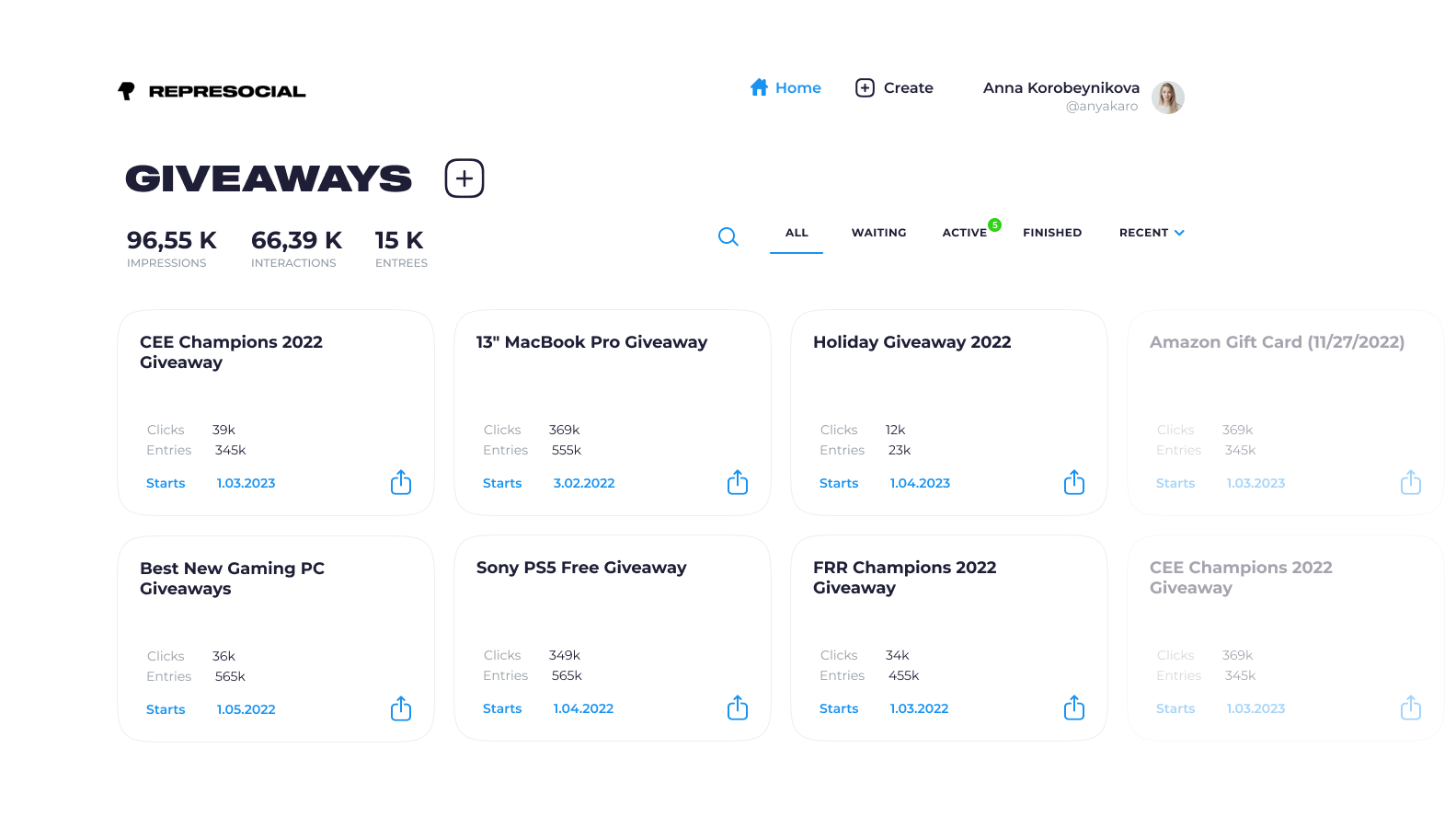 Represocial — стартап из Германии, который обратился к нам с идеей проекта и набросками дизайна в Adobe XD. Сервис поможет создать и провести giveaway, а также сохранит результаты и статистику. Например, в нем можно сделать форму участия и выбрать победителя.
