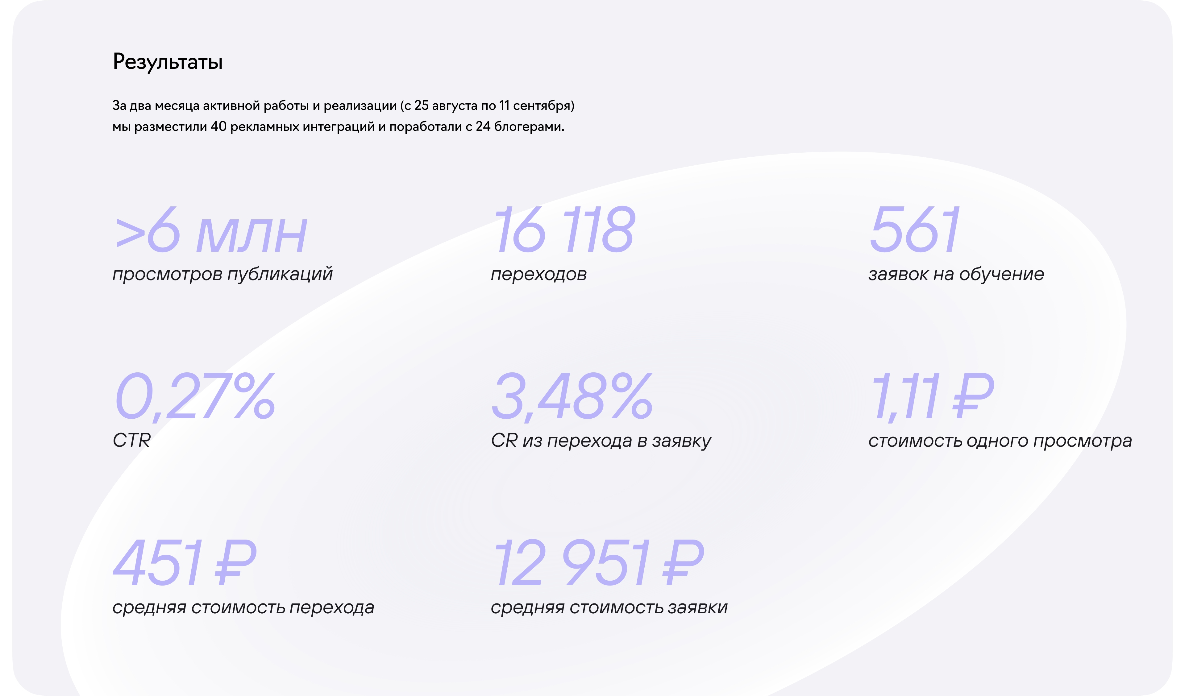 Основная сложность была в сжатых сроках: реализовать кампанию по рекламе у блогеров нужно было с 25 августа по 10 сентября. Как мы это реализовали — рассказываем в кейсе рекламы образовательных услуг.