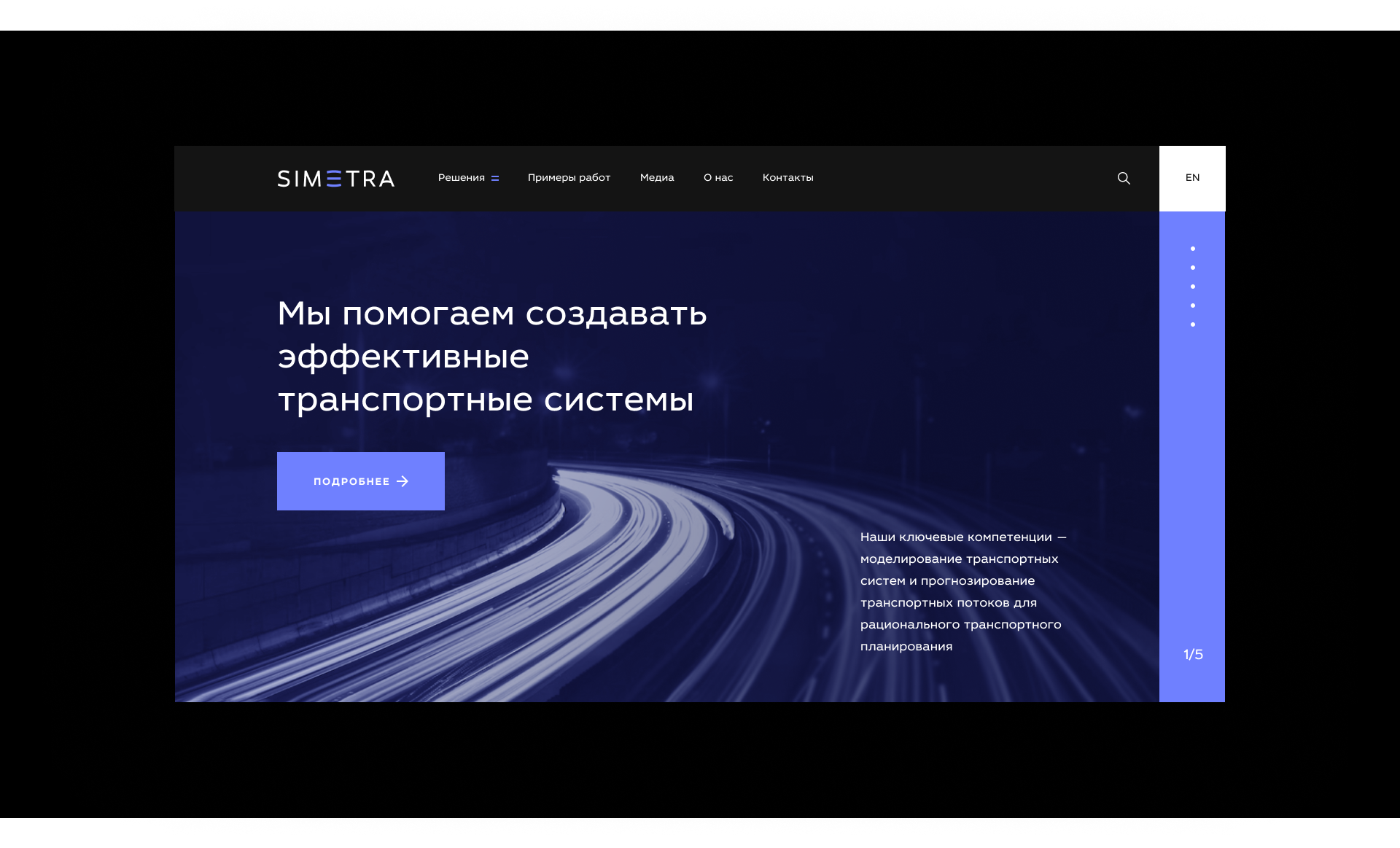 Переиспользовали блочный прием с брендбука компании и добавили интерактивный элемент — стрелку. Она появляется на кликабельных элементах, где мы можем совершить переход. Указываем направление, формируем маршрут, в котором может двигаться пользователь. Такое решение перекликается со спецификой работы компании, моделирования транспортных потоков, и с главной идеей, которую ставит перед собой компания SIMETRA: задавать красоту движения.