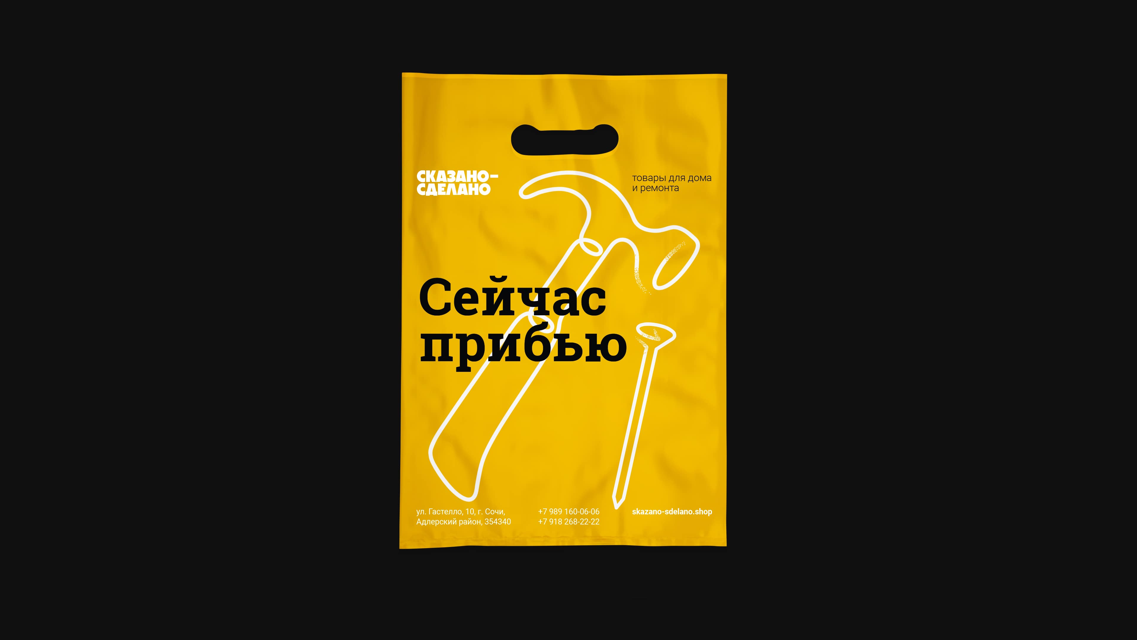 Наша задача — придумать название и разработать визуальный образ магазина товаров для дома и ремонта в Адлере. Название должно быть понятно целевой аудитории магазина — простым хозяйственным людям. Ощущение от бренда — будто общаешься с проверенным добрым парнем, который и посмеется с тобой вместе и вдумчиво поможет подобрать смеситель в ванную.