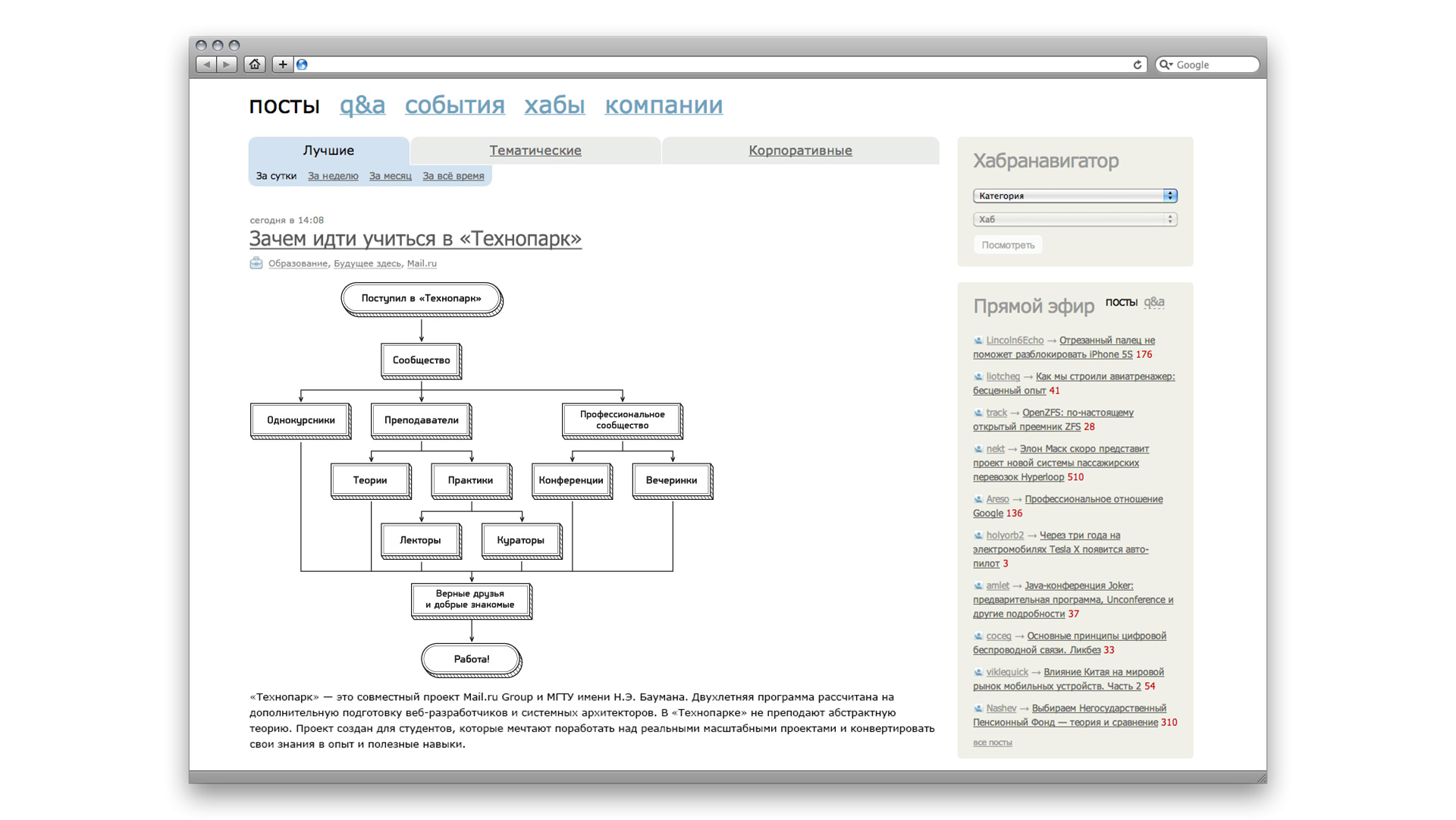 «Технопарк» — совместный образовательный проект компании Mail.Ru Group и МГТУ имени Н. Э. Баумана. Целью данного проекта является обучение и подготовка квалифицированных веб-разработчиков и системных архитекторов. Образовательная программа рассчитана на два года. Это настоящая школа жизни для молодых специалистов. Она включает в себя не только лекции и семинары, но и обязательное участие в реальных проектах Mail.ru Group.