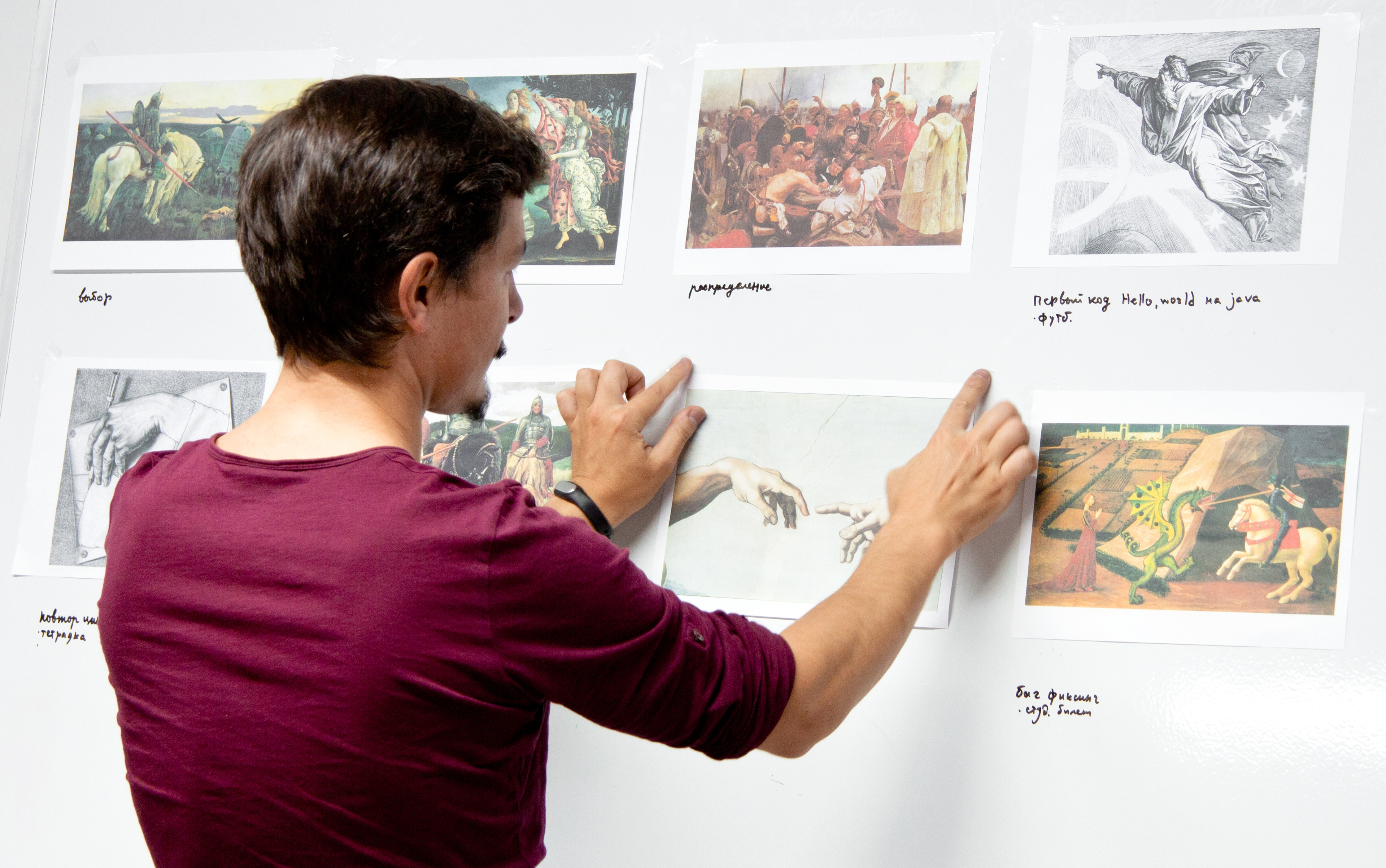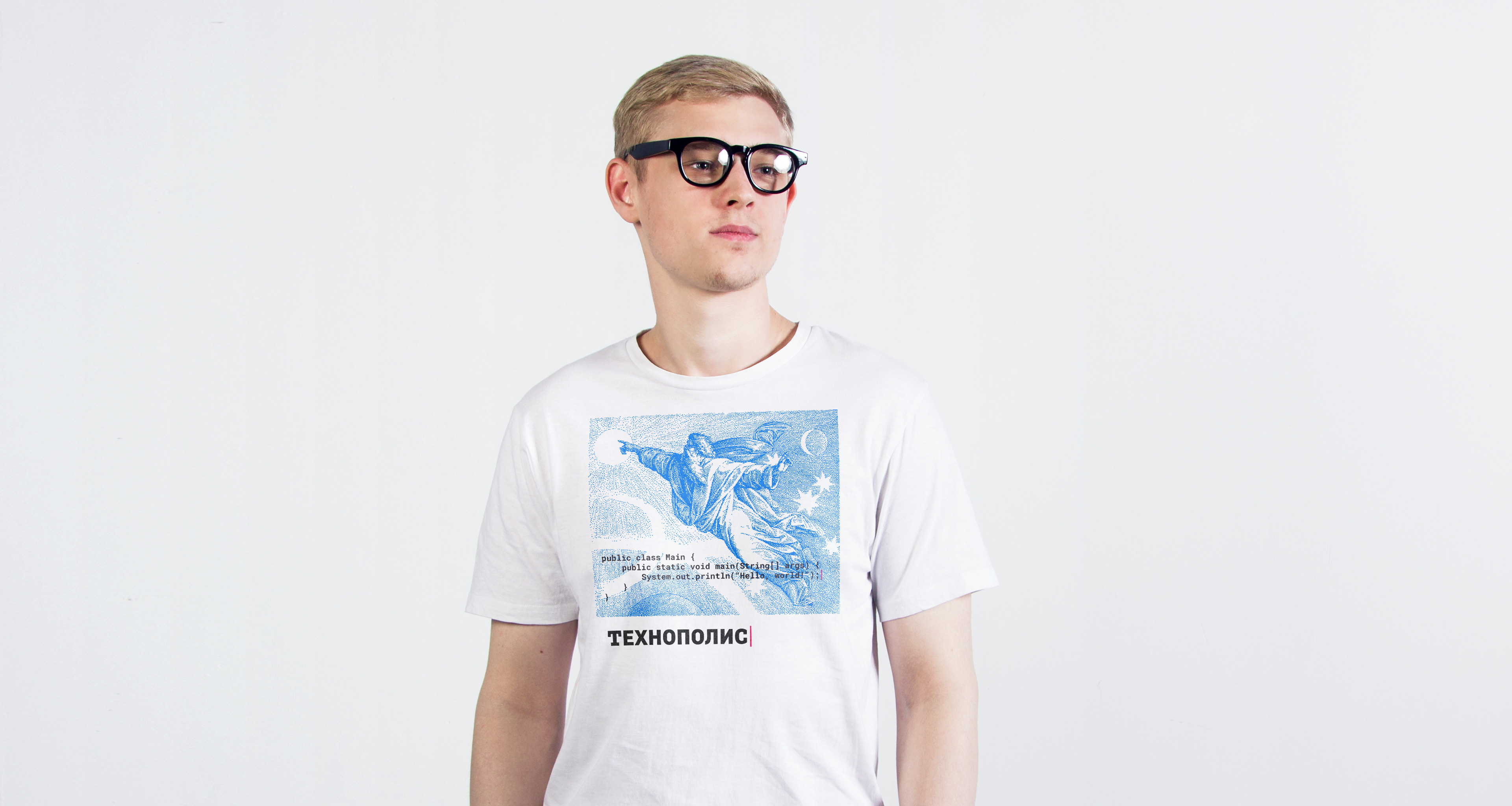 При поступлении всем студентам дарят фирменные футболки. На них мы разместили гравюру Юлиуса Шнорра фон Карольсфельда о четвертом дне творения мира и подкрепили её стандартной фразой, с которой начинается обучение кодингу: «Hello, world».