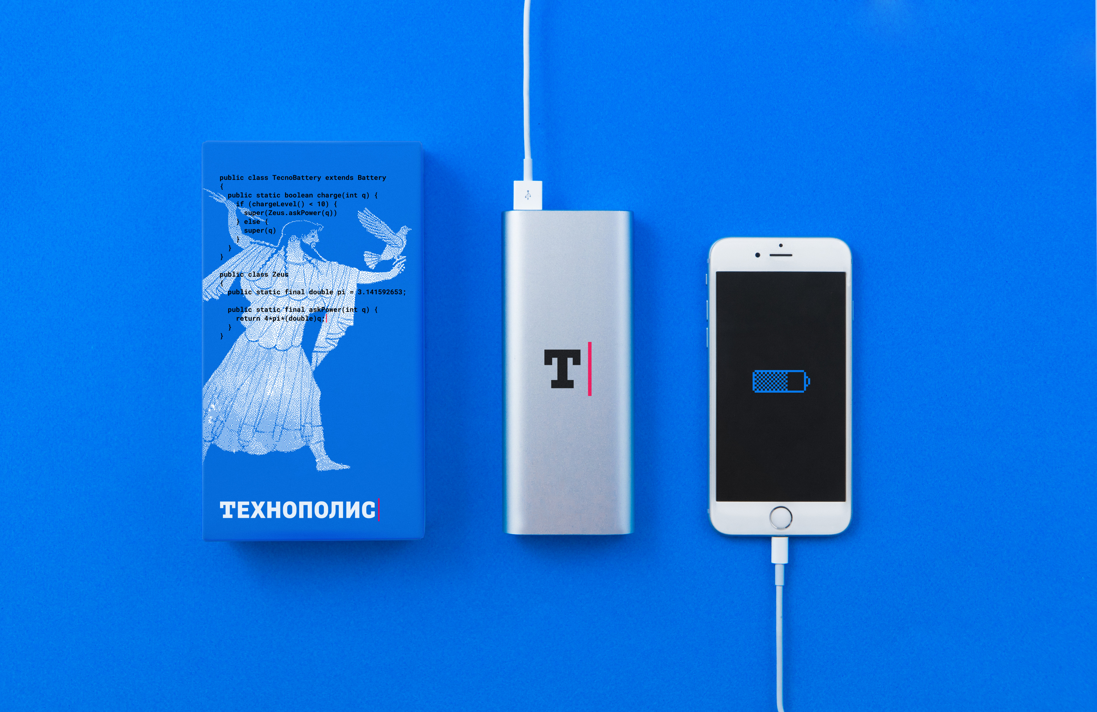 Для проработки концепции, мы старательно подбирали подходящие сюжеты, обращая внимание на самые мелкие детали. На зарядном устройстве для телефона показали бога грома и молний Зевса с древнегреческой амфоры неизвестного античного художника. Изображение поддержали кодом, который передает сообщение: если текущий уровень заряда меньше 10, то запрашиваем электричество у Зевса, если больше или равно — перестаем волноваться о судьбе своего устройства.