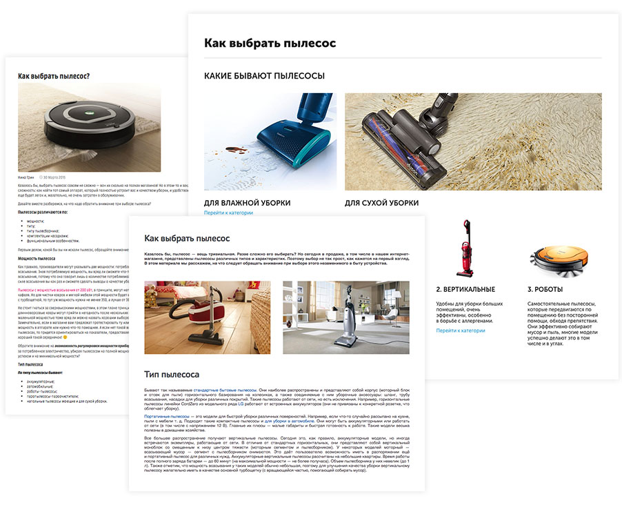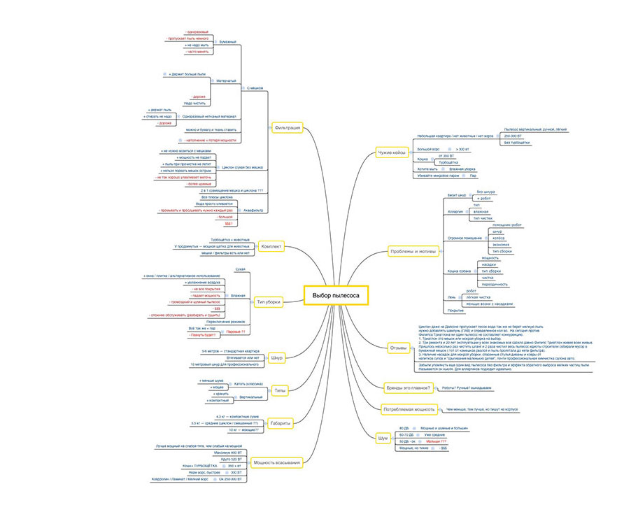 Так выглядит попытка охватить все особенности пылесосов, связать их с нуждами и проблемами покупателей. И статьи, откуда можно это узнать. Не будем драматизировать — со временем мы понимаем, что на такие глубины опускаться нет смысла.