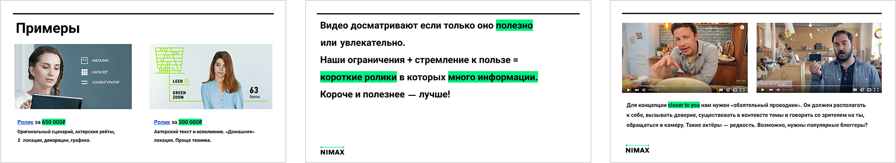 Никогда не выходим за хронометраж, убираем всё, что кажется очевидным или не важным. Один ролик — одна тема.