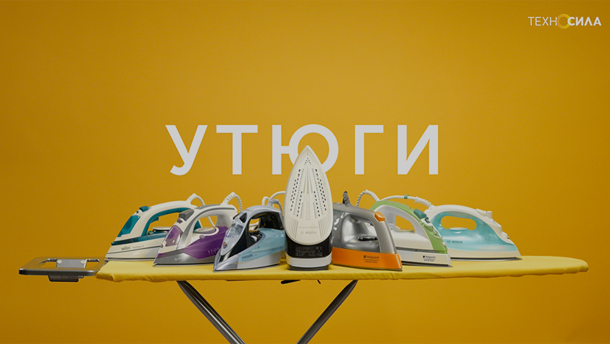 Вторая наша пара: обзор разных утюгов и рассказ об одной модели. Чтобы выиграть время на постановке — кадры двух роликов иногда дублируем, меняем только детали и героев.