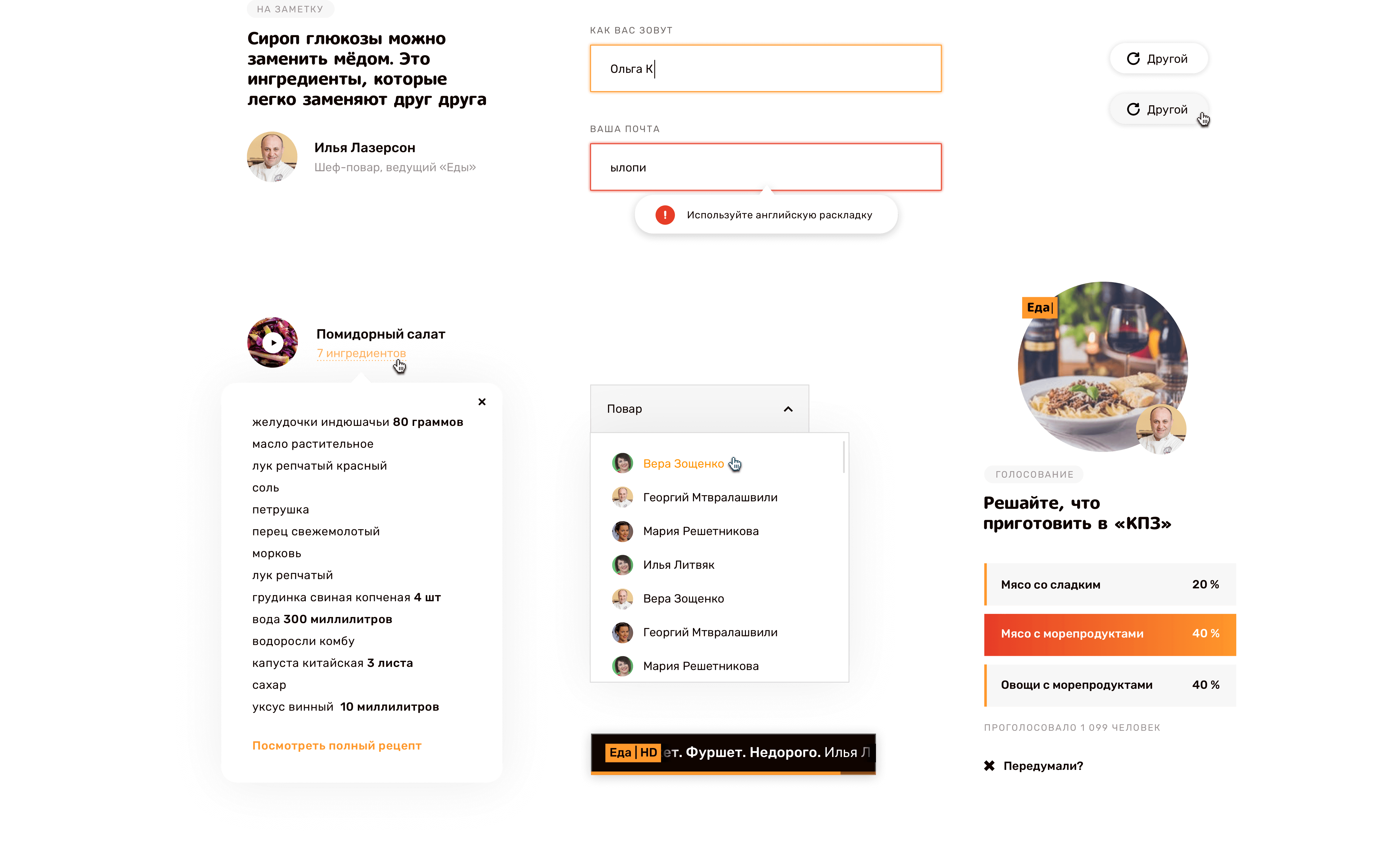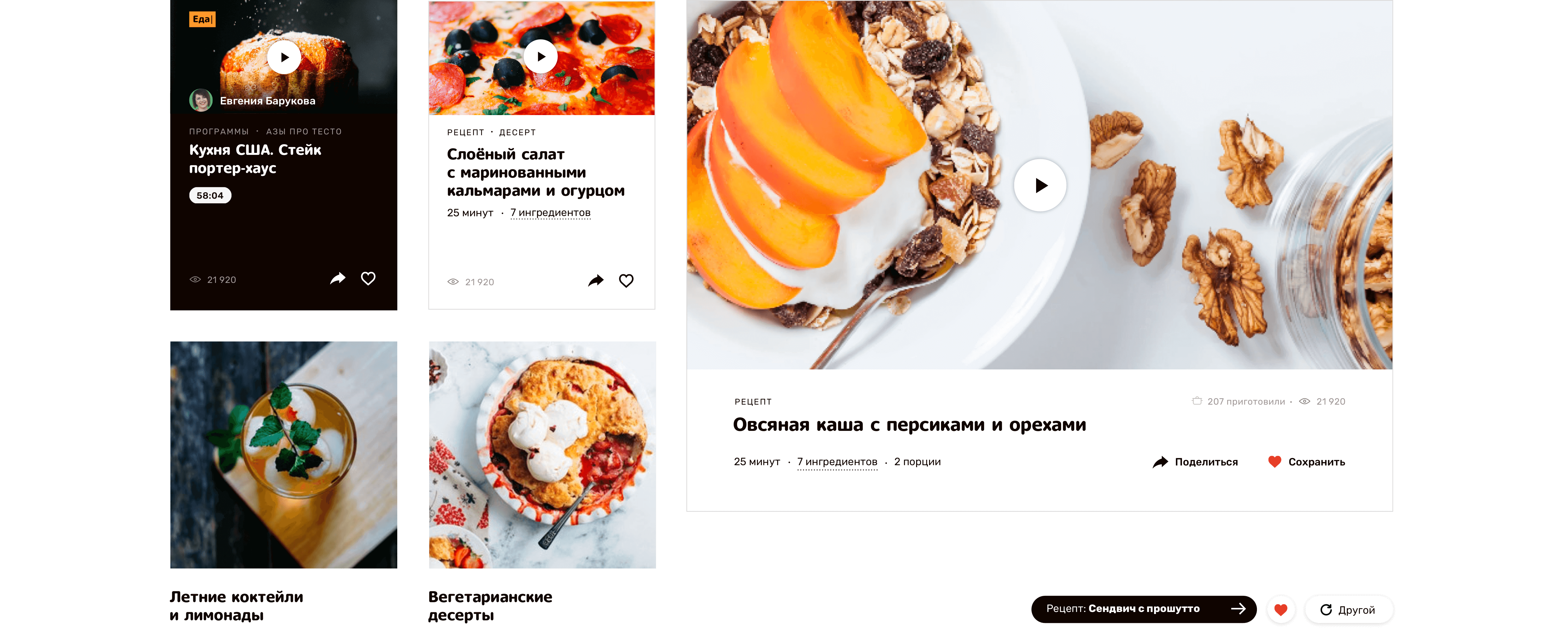 Подобраться к проекту было непросто. «Еда» пришла крупной, насыщенной контентом и функциями. Внутри одного сайта — четыре самостоятельных: телевизор, рецепты, личный кабинет и закрытый «Тайный клуб» с платной подпиской.