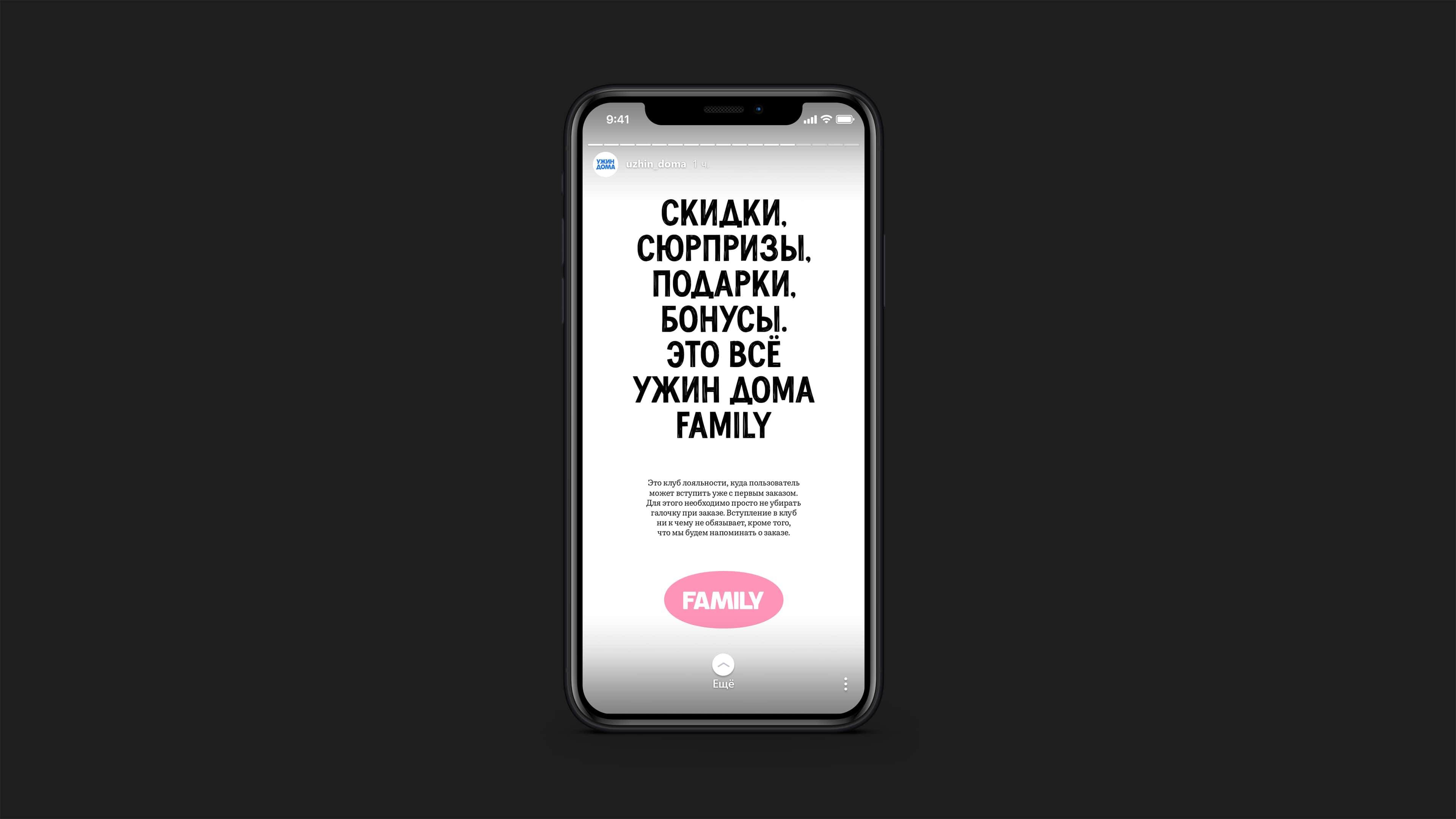 Вместе с ребрендингом клиент запустил новую программу лояльности — Ужин дома Family, в которой дарит скидки и подарки за повторные заказы. Мы выделили программу нежно-розовым цветом, сделали отдельный логотип, а также подготовили иллюстрации в узнаваемой технике.