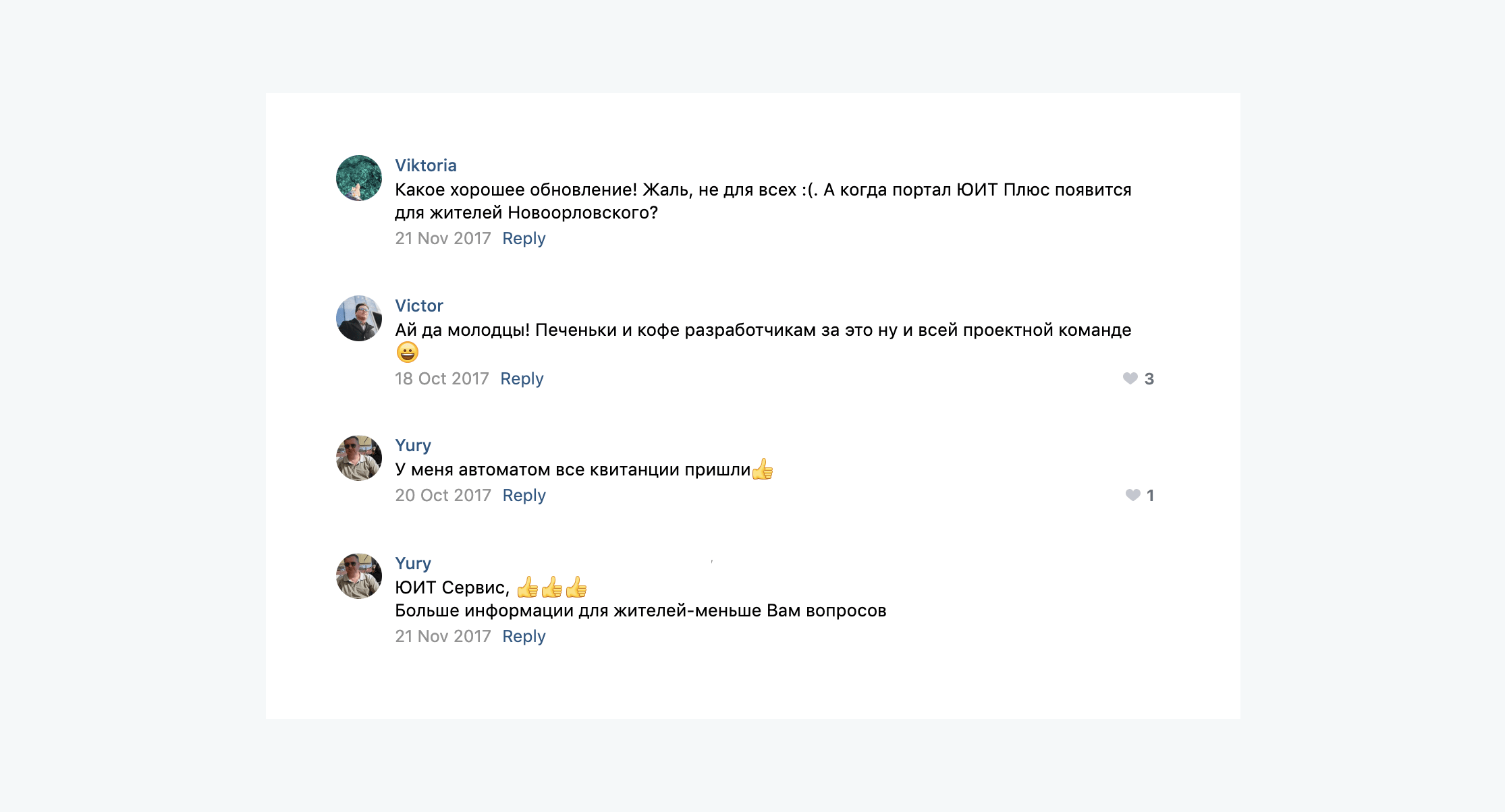 Работу над сервисом продолжили и после запуска — для постоянного обновления настроили работу по двухнедельным спринтам. Сами контролируем планирование, тесты, релизы и постоянно на связи с другими участниками сервиса: бухгалтерией, платежной системой, разработчиками ЮИТ, дольщиками и жителями. Регулярно получаем обратную связь от всех пользователей. Это помогает делать сервис еще удобнее и проще.