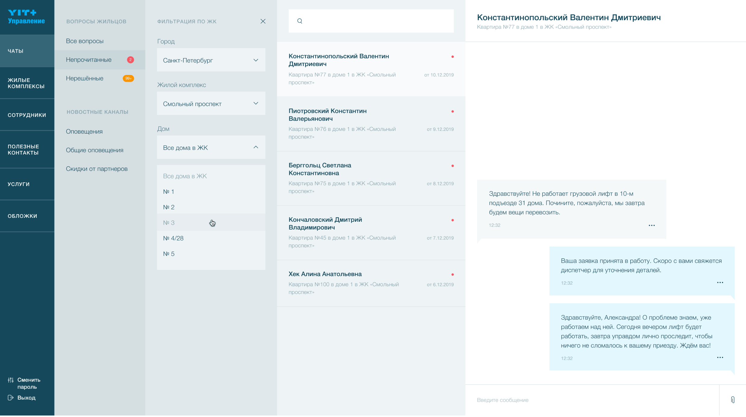 Не забыли о сотрудниках службы поддержки ЮИТ Сервис: из админки удобно управлять чатами, каталогом услуг, обновлять весь необходимый контент, например, контакты команды дома и районных служб. Постоянно улучшаем интерфейс, сокращая время на выполнение основных операций.