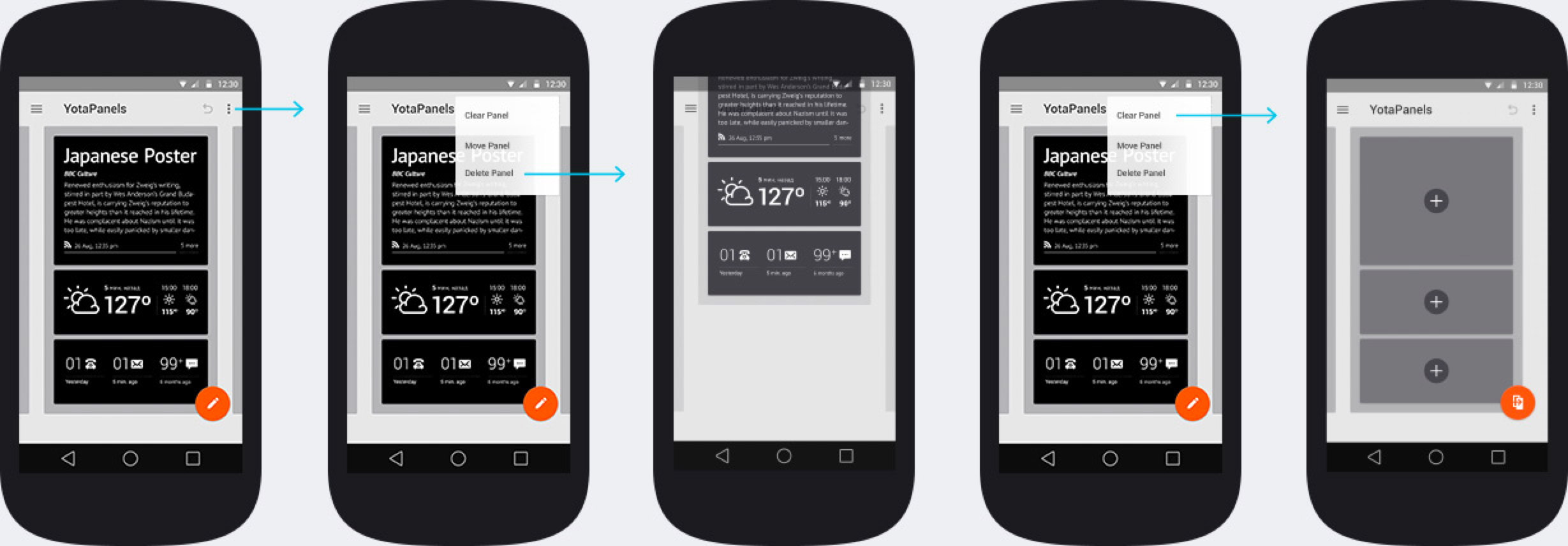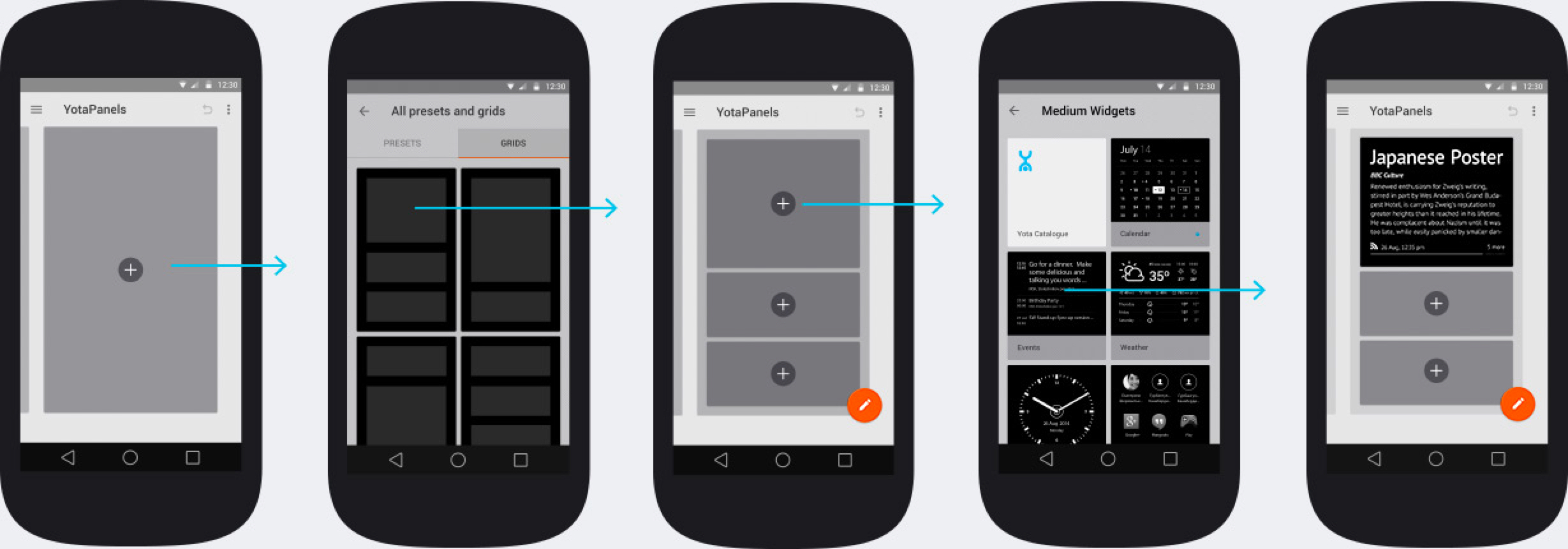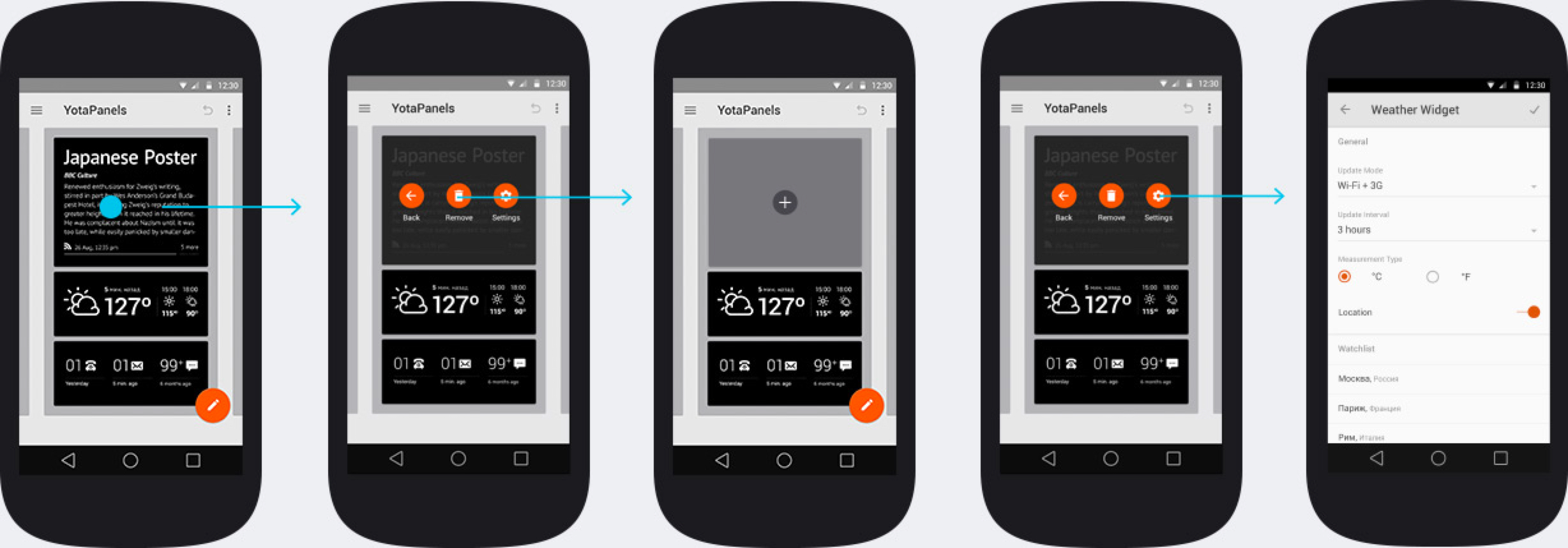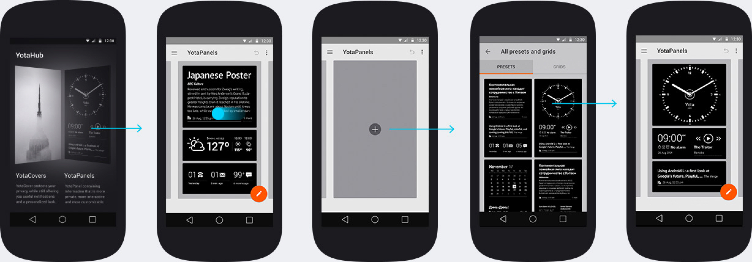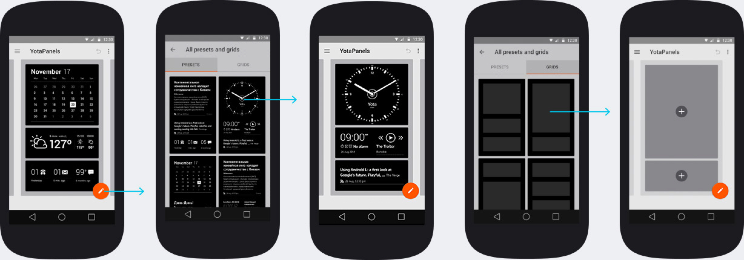 YotaPanels состоит из четырёх редактируемых панелей с виджетами. Как будет выглядеть каждая, решит пользователь. Приложение предложит два пути: выбрать готовые панели или скомпоновать каждую самостоятельно.