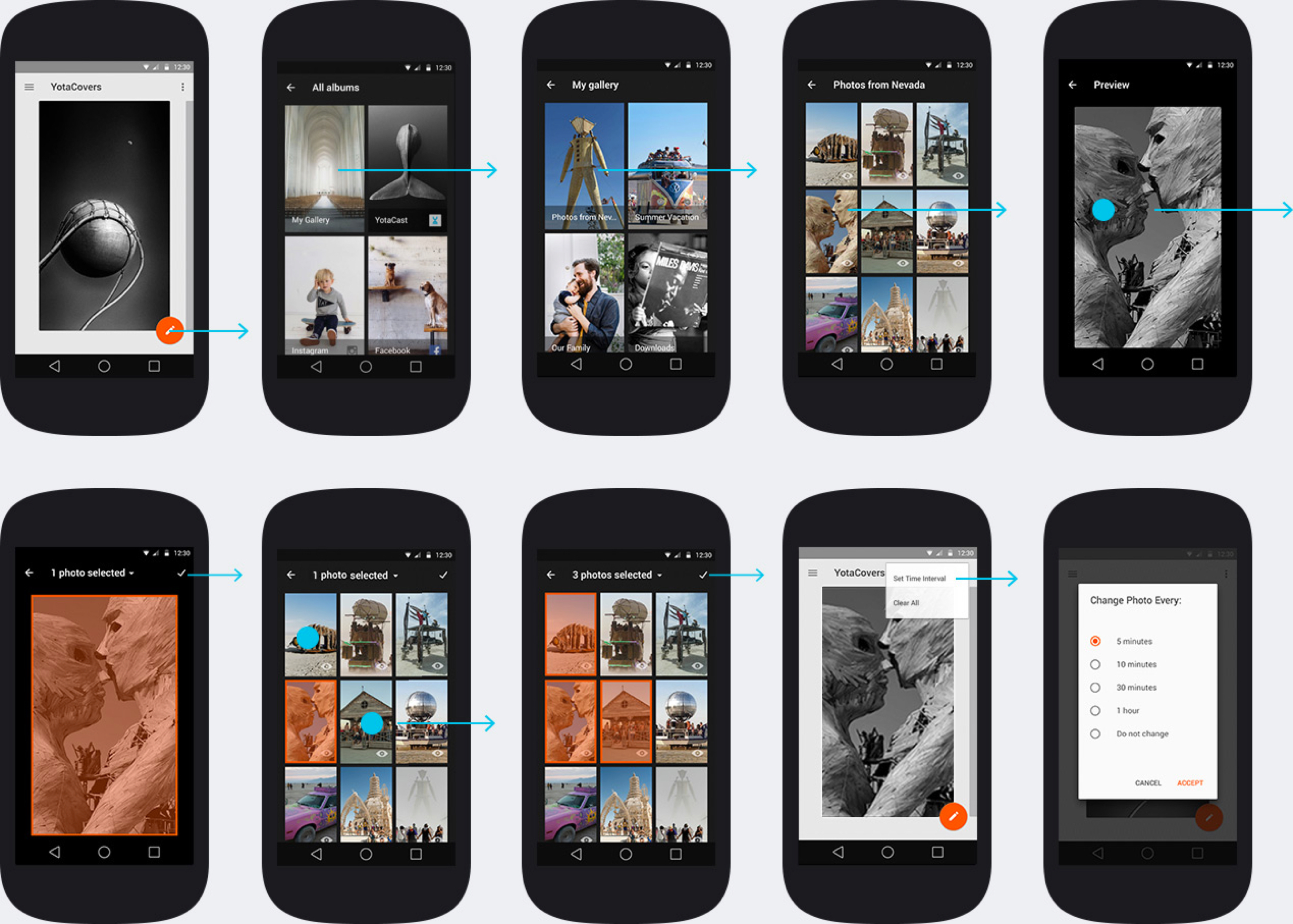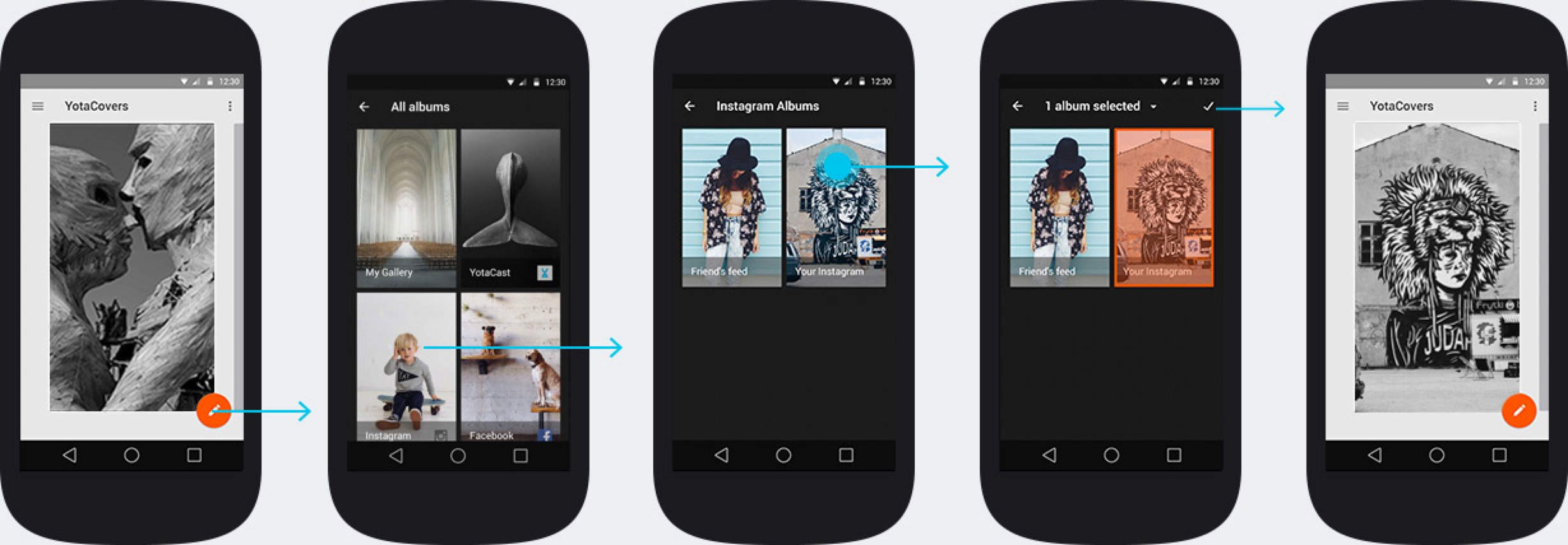 Другая часть приложения — YotaCovers, интерфейс для управления обложками. Они выполняют две функции: преображают внешний вид устройства и оберегают персональные данные владельца. В YotaCovers доступны фотографии с телефона, социальных сетей и специальной папки с чёрно-белыми иллюстрациями YotaCast.
